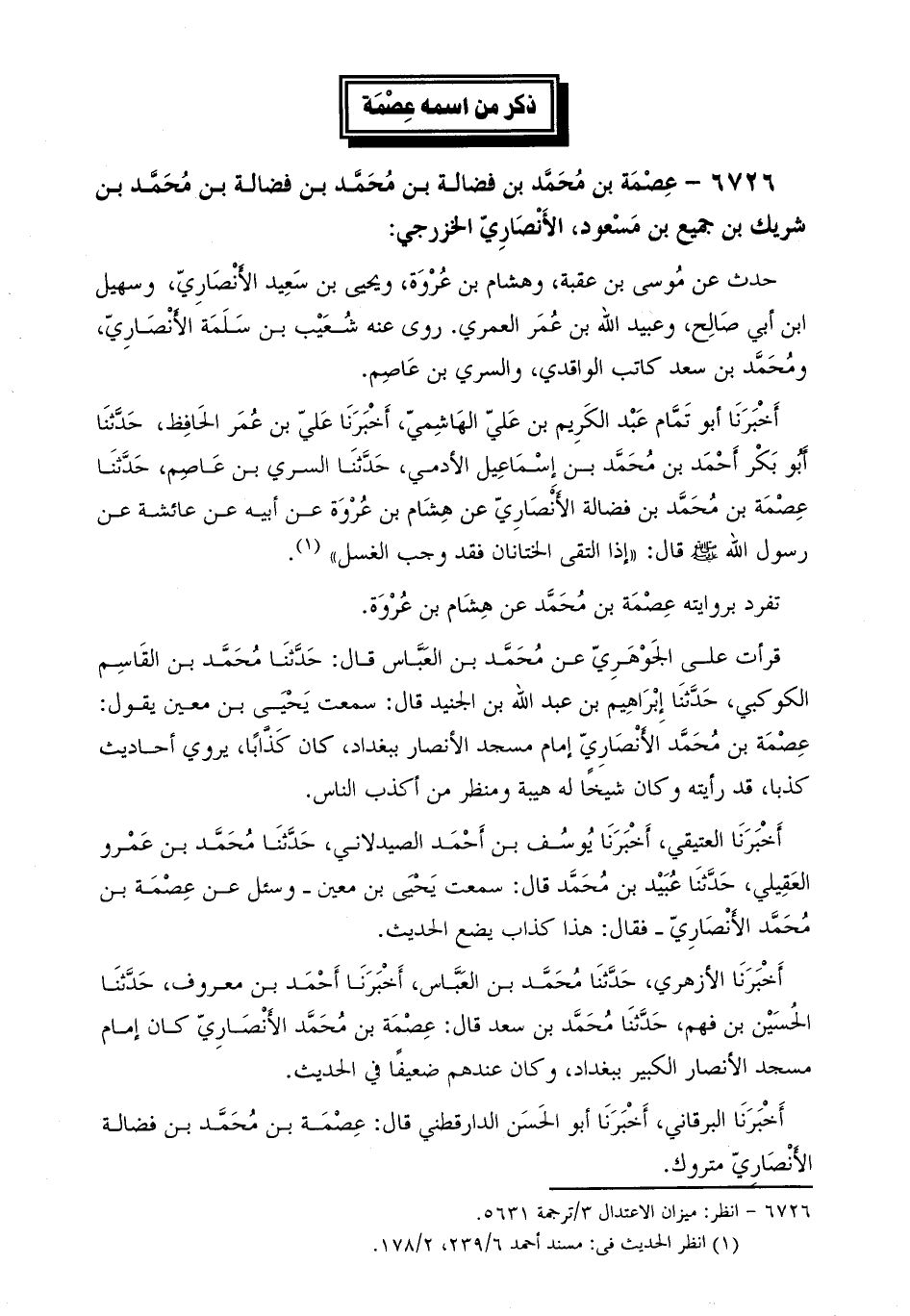 أَخْبَرَنَا أَبُو تَمَّامٍ عَبْدُ الْكَرِيمِ بْنُ عَلِيٍّ الهاشميّ، أخبرنا عليّ بن عمر الحافظ، حَدَّثَنَا أبو بكر أحمد بن محمد بن إسماعيل الأدمي، حدّثنا السري بن عاصم، حَدَّثَنَا عِصْمَةُ بْنُ مُحَمَّدِ بْنِ فَضَالَةَ الأَنْصَارِيُّ عَنْ هِشَامِ بْنِ عُرْوَةَ عَنْ أَبِيهِ عَنْ عَائِشَةَ عَنْ رَسُولِ اللَّهِ صَلَّى اللَّهُ عَلَيْهِ وَسَلَّمَ قَالَ: «إِذَا الْتَقَى الْخِتَانَانِ فَقَدْ وَجَبَ الْغُسْلُ» [2] .