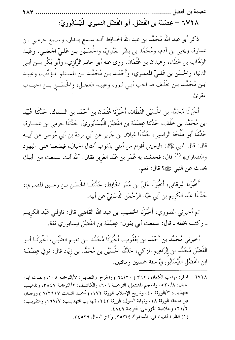 6728- عصمة بْن الفضل، أَبُو الفضل النميري النيسابوري [1] :