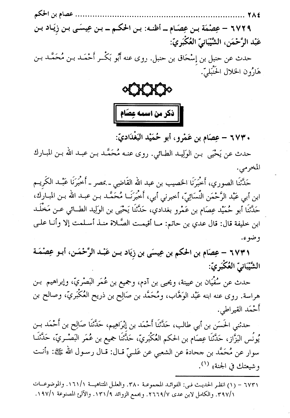6731- عصام بْن الحكم بْن عيسى بْن زياد بْن عبد الرحمن، أَبُو عصمة الشيباني العكبري: