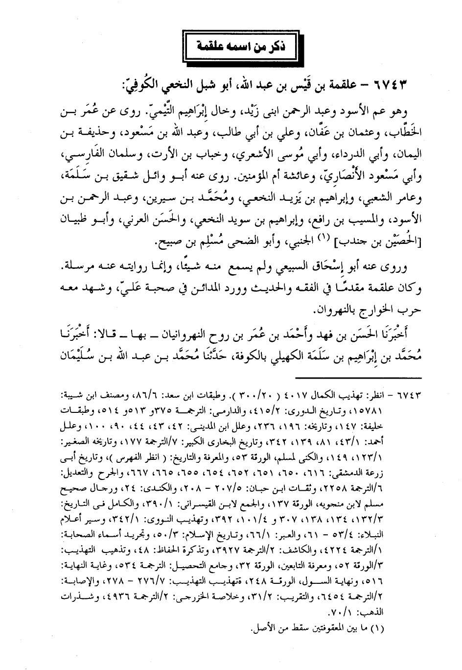 [1] 6743- انظر: تهذيب الكمال 4017 (20/300) . وطبقات ابن سعد: 6/86، ومصنف ابن شيبة: