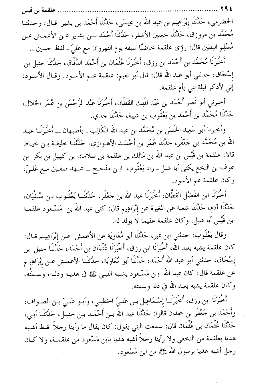أخبرنا ابن رزق، أَخْبَرَنَا إسماعيل بن علي الخطبي، وأبو علي بن الصواف، وأحمد بْن جَعْفَر بْن حمدان قالوا: حَدَّثَنَا عَبْد الله بن أحمد بن حنبل، حدّثنا أبي، حَدَّثَنَا عثمان بْن عثمان قَالَ: سمعت البتي يقول: كان يقال ما رأينا رجلا قط أشبه هديا بعلقمة من النخعي ولا رأينا رجلا أشبه هديا بابن مسعود من علقمة، ولا كان رجل أشبه هديا برسول اللَّه صَلَّى اللَّهُ عَلَيْهِ وَسَلَّمَ من ابْن مسعود.
