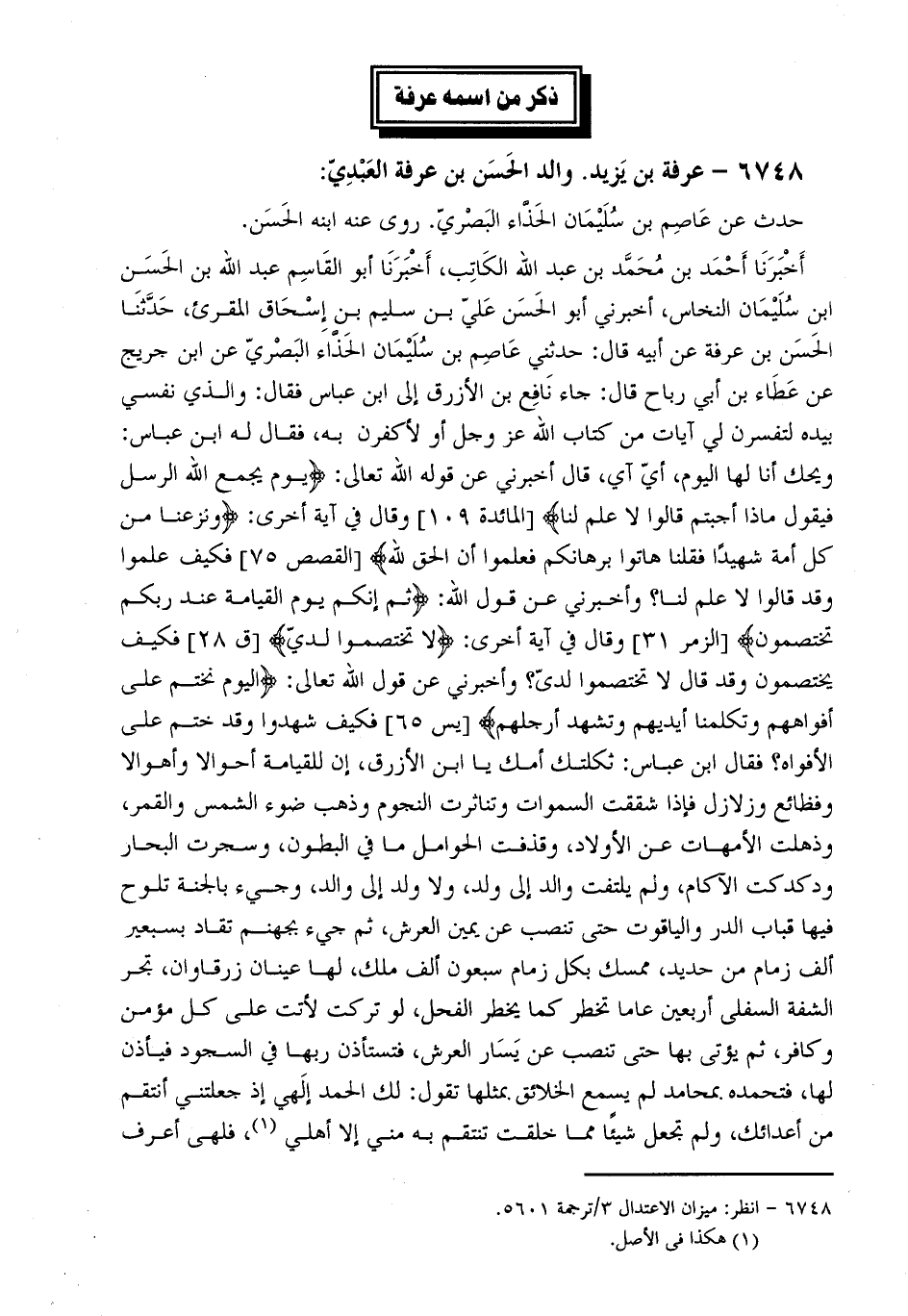 6748- عرفة بْن يزيد. والد الحسن بْن عرفة العبدي [1] :