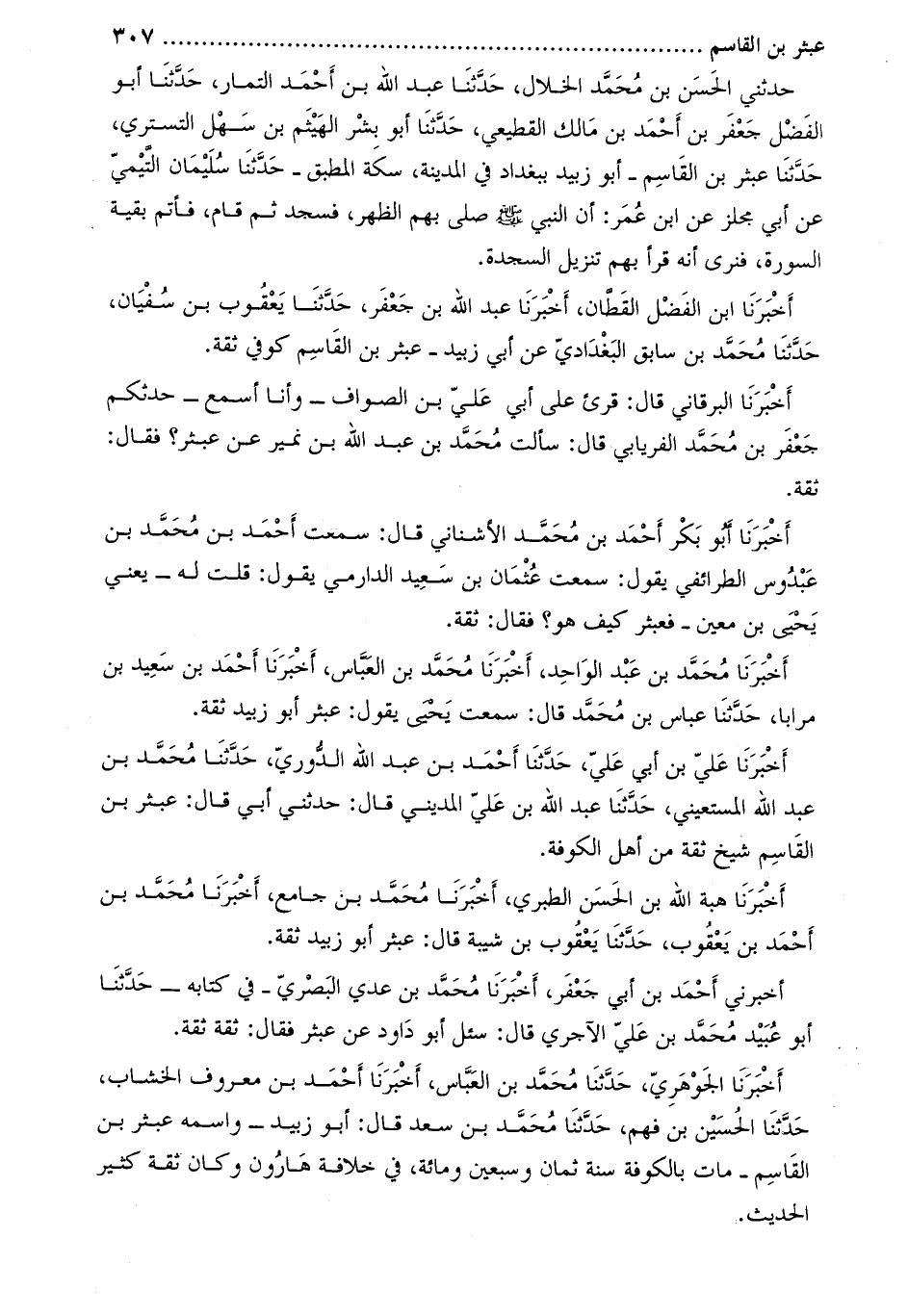 حدثني الحسن بن محمّد الخلال، حدّثنا عبد الله بن أحمد التمار، حَدَّثَنَا أَبُو الْفَضْلِ جَعْفَرُ بْنُ أَحْمَدَ بْنِ مالك القطيعي، حَدَّثَنَا أَبُو بِشْرٍ الْهَيْثَمُ بْنُ سَهْلٍ التُّسْتَرِيُّ، حَدَّثَنَا عَبْثَرُ بْنُ الْقَاسِمِ- أَبُو زُبَيْدٍ بِبَغْدَادَ في المدينة، سكة المطبق- حَدَّثَنَا سُلَيْمَانُ التَّيْمِيُّ عَنْ أَبِي مِجْلَزٍ عَنِ ابْنِ عُمَرَ: أَنَّ النَّبِيَّ صَلَّى اللَّهُ عَلَيْهِ وَسَلَّمَ صَلَّى بِهِمُ الظُّهْرَ، فَسَجَدَ ثُمَّ قَامَ، فَأَتَمَّ بَقِيَّةَ السُّورَةِ، فَنَرَى أَنَّهُ قَرَأَ بِهِمْ تَنْزِيلَ السجدة.