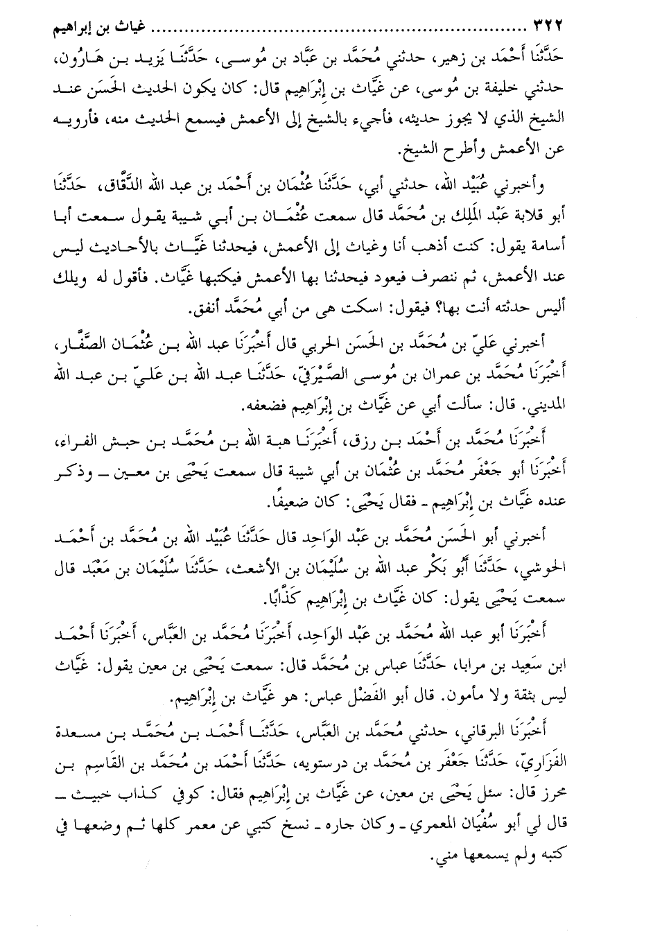 حدّثنا أحمد بن زهير، حدثني محمّد بن عبّاد بن موسى، حدّثنا يزيد بن هارون، حَدَّثَني خليفة بْن موسى، عَنْ غياث بْن إبراهيم قَالَ: كان يكون الحديث الحسن عند الشيخ الذي لا يجوز حديثه، فأجيء بالشيخ إلى الأعمش فيسمع الحديث منه، فأرويه عَنِ الأعمش وأطرح الشيخ.