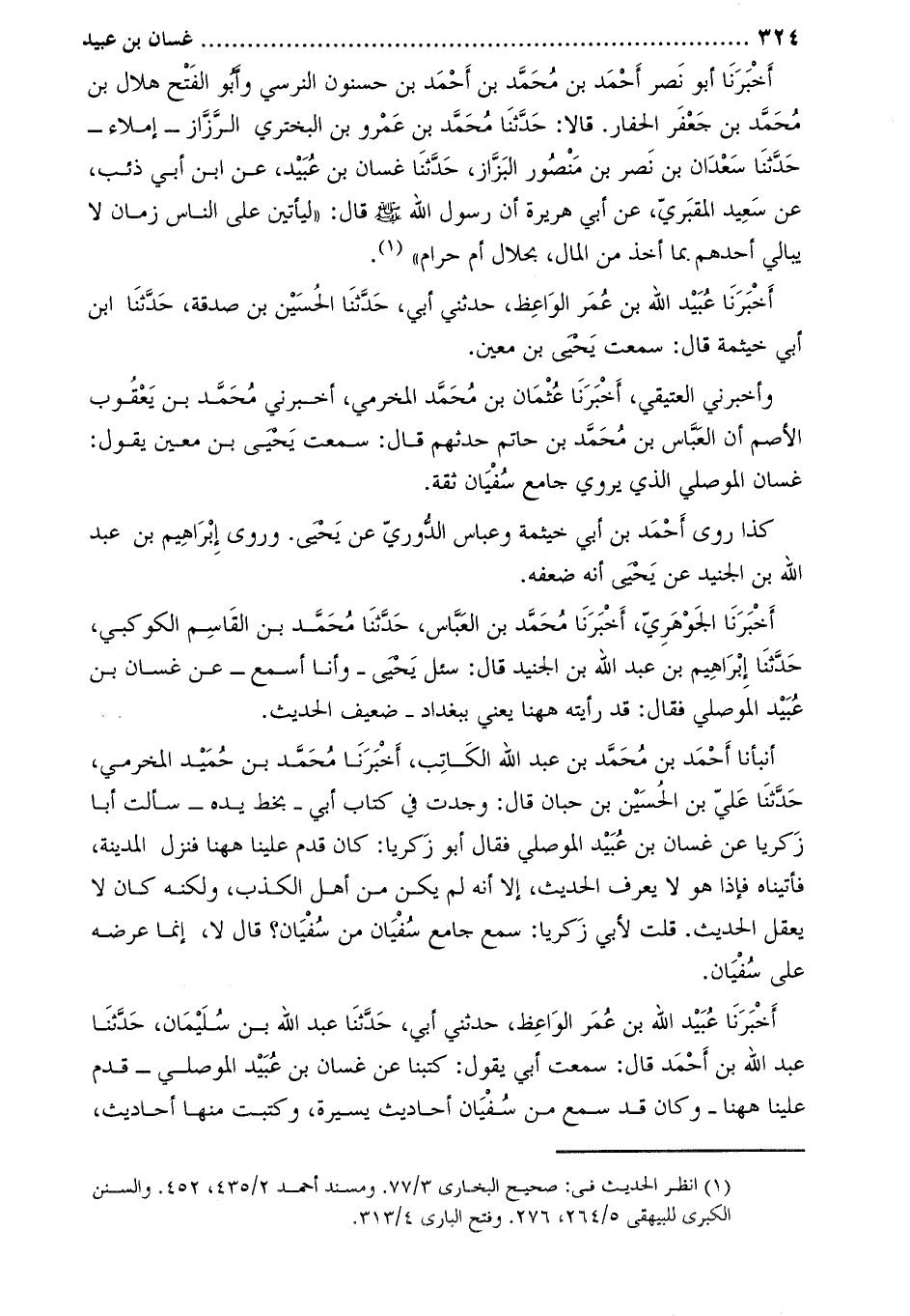 أَنْبَأنَا أَحْمَد بْن مُحَمَّد بْن عَبْد الله الكاتب، أخبرنا محمّد بن حميد المخرمي، حدثنا علي بن الحسين بن حبان قال: وجدتُ فِي كتاب أبي- بِخط يده- سألتُ أبا زكريا عَنْ غسان بْن عبيد الموصلي فقال أبو زكريا: كان قدم علينا هاهنا فنزل المدينة، فأتيناه فإذا هو لا يعرف الحديث، إلا أنه لم يكن من أهل الكذب، ولكنه كان لا يعقل الحديث. قلت لأبي زكريا: سمع جامع سفيان من سفيان؟ قَالَ لا، إنما عرضه على سفيان.
