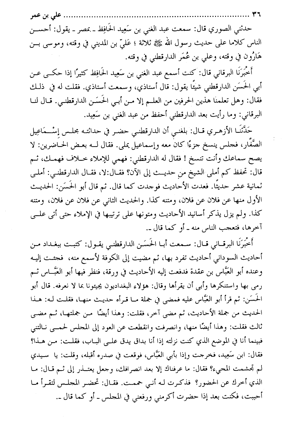 حَدَّثَنَا الأزهري قَالَ: بلغني أن الدارقطني حضر فِي حداثته مجلس إِسْمَاعِيل الصفار، فجلس ينسخ جزءا كان معه وإسماعيل يملي. فقال له بعض الحاضرين: لا يصح سماعك وأنت تنسخ! فقال له الدارقطني: فهمي للإملاء خلاف فهمك، ثم قَالَ: تحفظ كم أملي الشيخ من حديث إِلَى الآن؟ فقال: لا، فقال الدارقطني: أملي ثمانية عشر حديثا. فعدت الأحاديث فوجدت كما قَالَ. ثم قَالَ أَبُو الحسن: الحديث الأول منها عَن فلان عَن فلان، ومتنه كذا. والحديث الثاني عَن فلان عَن فلان، ومتنه كذا. ولم يزل يذكر أسانيد الأحاديث ومتونها على ترتيبها فِي الإملاء حتى أتى على آخرها، فتعجب الناس منه- أو كما قَالَ-.