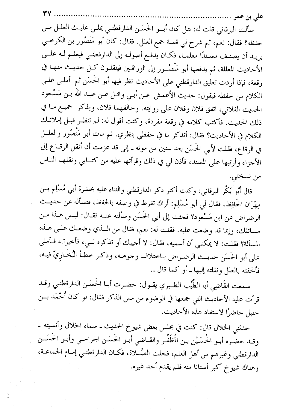 سألت البرقاني قلت له: هل كان أَبُو الحسن الدارقطني يملى عليك العلل من حفظه؟ فقال: نعم، ثم شرح لي قصة جمع العلل. فقال: كان أبو منصور بن الكرخي يريد أن يصنف مسندا معلما، فكان يدفع أصوله إِلَى الدارقطني فيعلم له على الأحاديث المعللة، ثم يدفعها أَبُو منصور إِلَى الوراقين فينقلون كل حديث منها فِي رقعة، فإذا أردت تعليق الدارقطني على الأحاديث نظر فيها أَبُو الحسن ثم أملى عليَّ الكلام من حفظه فيقول: حَدِيثِ الأَعْمَشِ عَنْ أَبِي وَائِلٍ عَنْ عَبْدِ اللَّهِ بْنِ مسعود الحديث الفلاني، اتفق فلان وفلان على روايته. وخالفهما فلان، ويذكر جميع ما فِي ذلك الحديث. فاكتب كلامه فِي رقعة مفردة، وكنت أقول له: لم تنظر قبل إملائك الكلام فِي الأحاديث؟ فقال: أتذكر ما فِي حفظي بنظري. ثم مات أَبُو منصور والعلل فِي الرقاع، فقلت لأبي الحسن بعد سنين من موته- إني قد عزمت أن أنقل الرقاع إِلَى الأجزاء وأرتبها على المسند، فأذن لي فِي ذلك وقرأتها عليه من كتابي ونقلها الناس من نسختي.