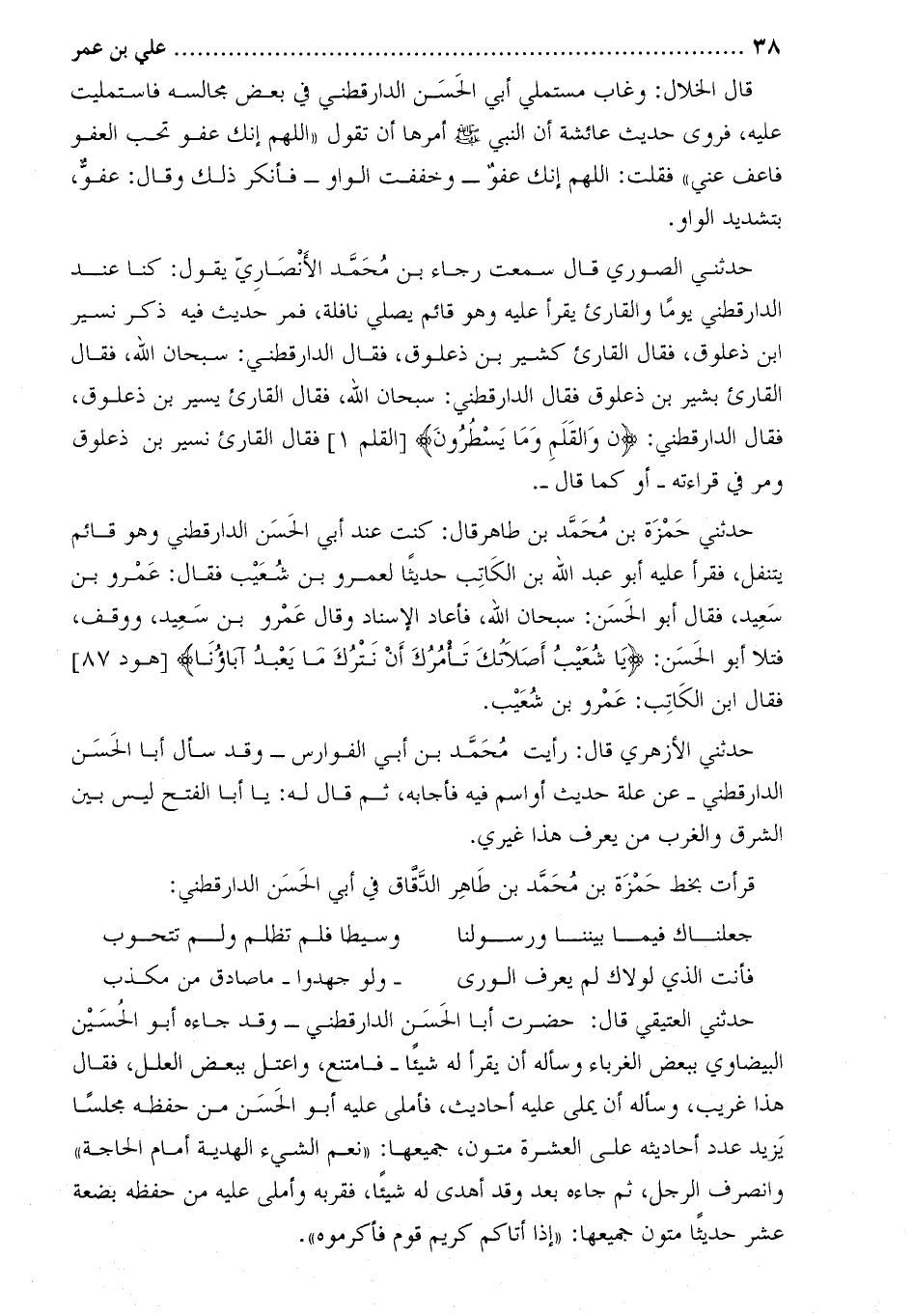 قَالَ الخلال: وغاب مستملي أَبِي الحسن الدارقطني فِي بعض مجالسه فاستمليت عليه، فروى حديث عَائِشَةَ أَنَّ النَّبِيَّ صَلَّى اللَّهُ عَلَيْهِ وَسَلَّمَ أمرها أن تقول «اللهم إنك عفو تحب العفو فاعف عني» فقلت: اللهم إنك عَفْوٌ- وخففت الواو- فأنكر ذلك وَقَالَ: عفو، بتشديد الواو.
