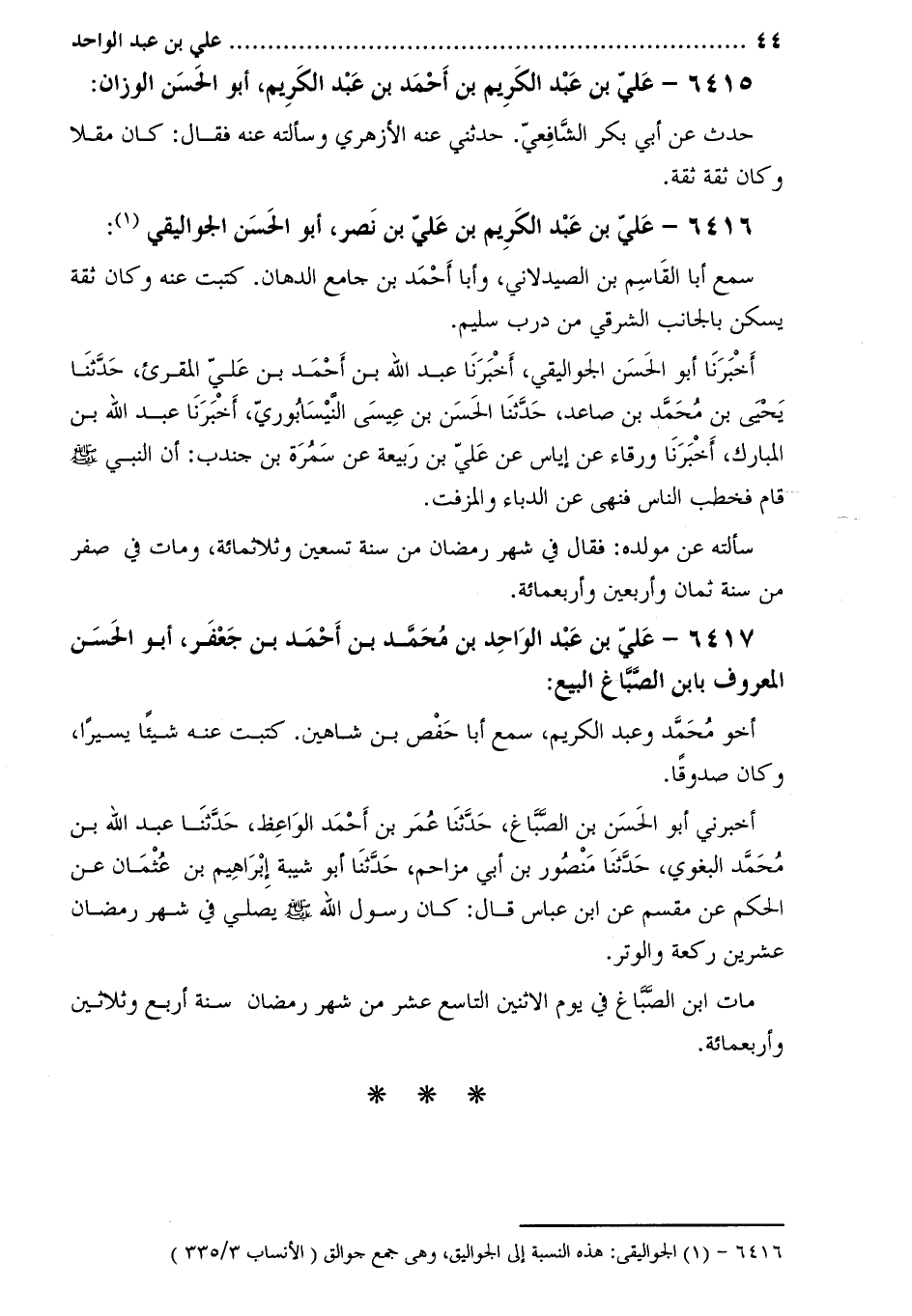 [1] 6416- الجواليقي: هذه النسبة إلى الجواليق، وهي جمع جوالق (الأنساب 3/335)