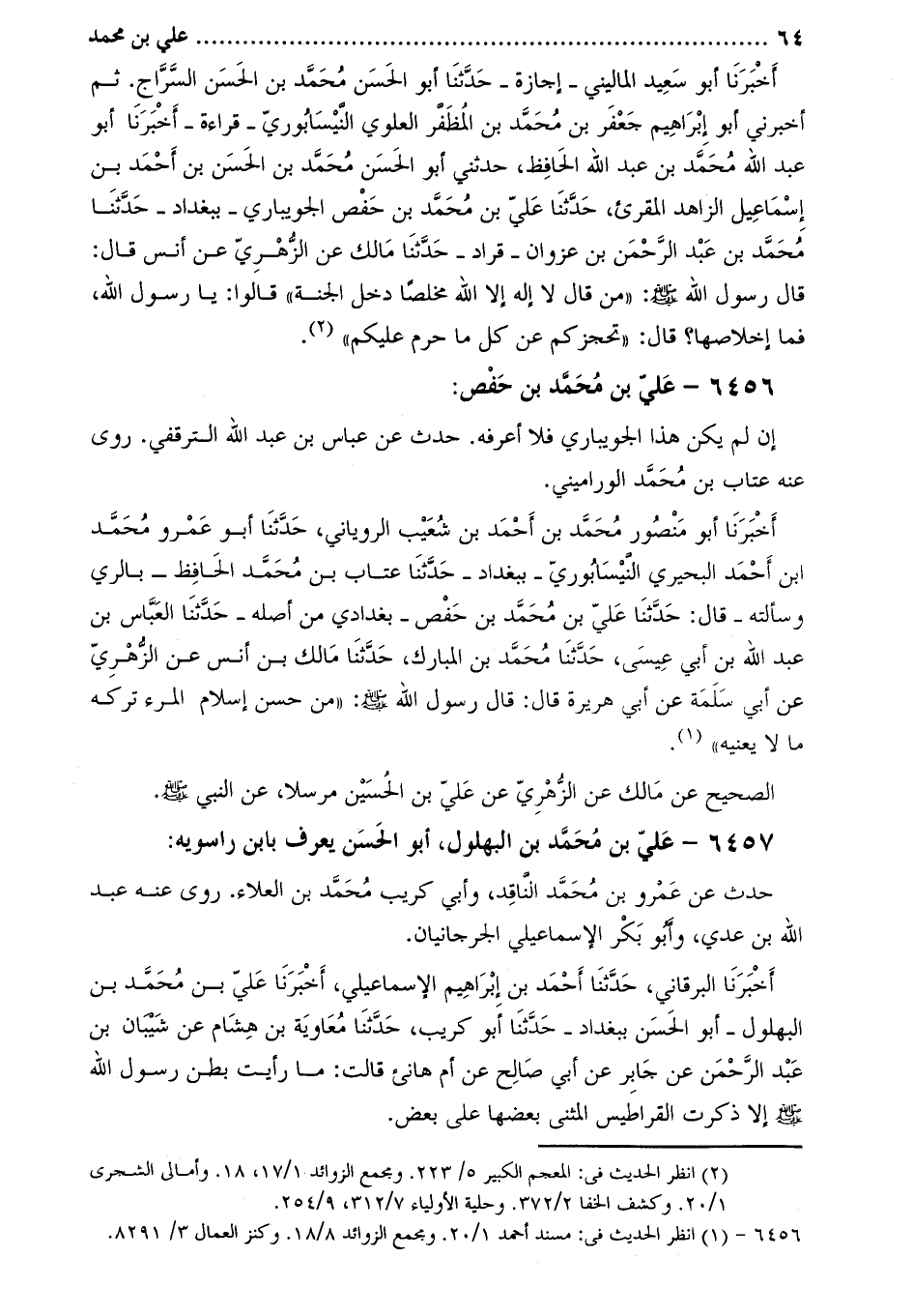 [2] 6456- انظر الحديث في: مسند أحمد 1/20. ومجمع الزوائد 8/18. وكنز العمال 3/8291.