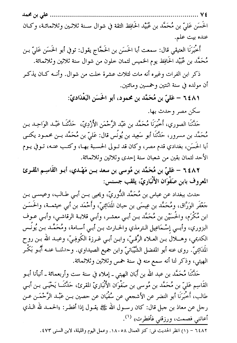 6482- عليّ بن محمد بن موسى بن سعد بْن مهدي، أَبُو القاسم المقرئ المعروف بابن صفوان الأنباريّ، يلقب جسنس: