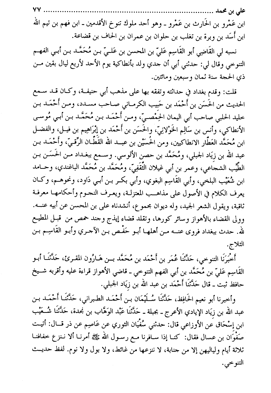 أخبرنا التنوخي، حدّثنا عُمَرُ بْنُ أَحْمَدَ بْنِ مُحَمَّدِ بْنِ هَارُونَ المقرئ، حَدَّثَنَا أَبُو الْقَاسِمِ عَلِيُّ بْنُ مُحَمَّدِ بْنِ أَبِي الْفَهْمِ التَّنُوخِيُّ- قَاضِي الأَهْوَازِ قِرَاءَةً عَلَيْهِ وأقربه شَيْخٌ حَافِظٌ ثَبْتٌ- قَالَ حَدَّثَنَا أَحْمَدُ بْنُ عَبْدِ اللَّهِ بْنِ زِيَادٍ الْجَبَلِيُّ.