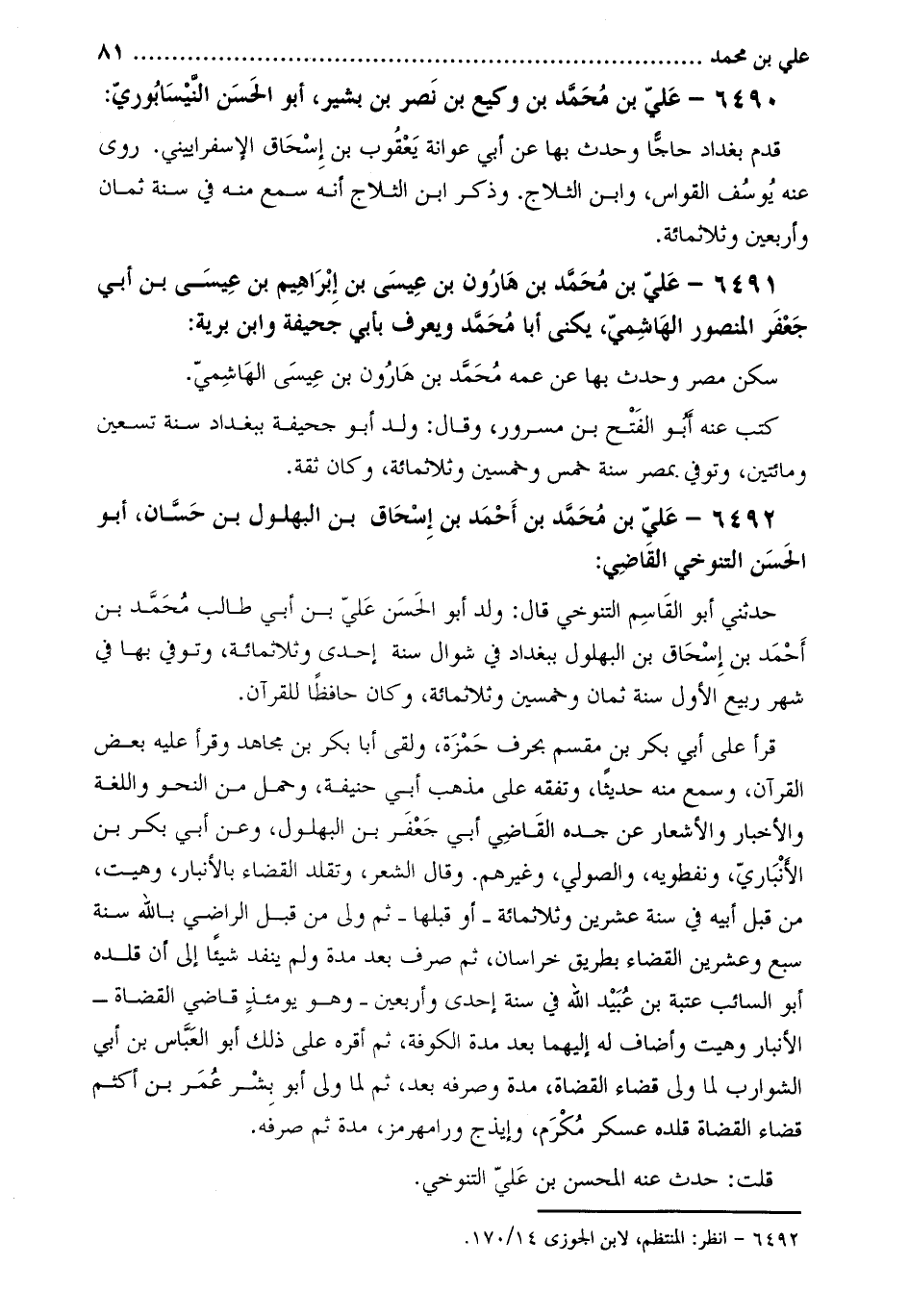 6492- علي بْن مُحَمَّدِ بْنِ أَحْمَدَ بْنِ إِسْحَاق بْن البهلول بْن حسان، أَبُو الحسن التنوخي القاضي [1] :
