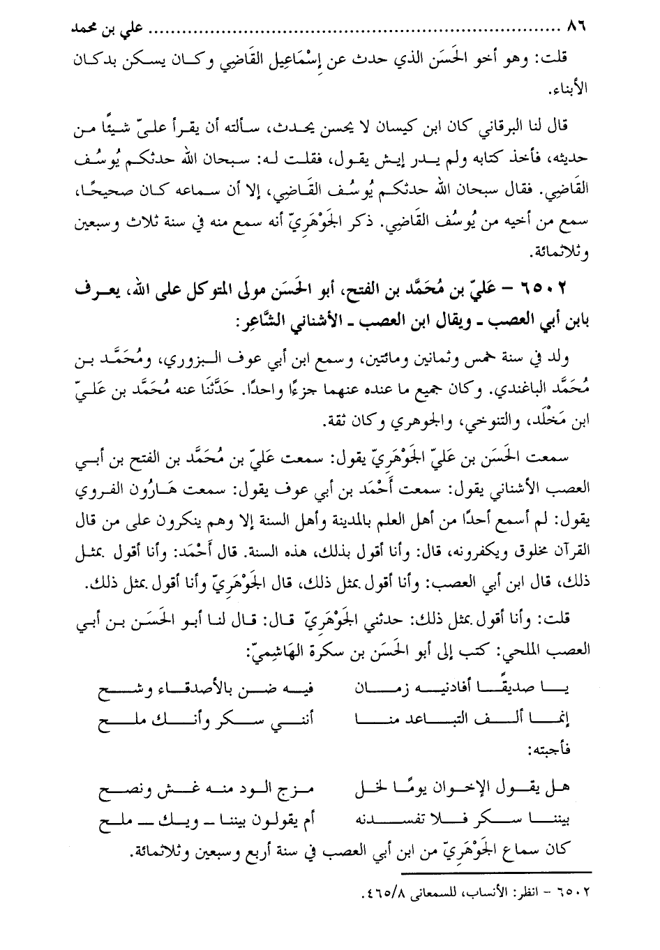 6502- علي بْن مُحَمَّد بْن الفتح، أَبُو الحسن مولى المتوكل على اللَّه، يعرف بابن أَبِي العصب- ويقال ابْن العصب- الأشناني الشاعر [1] :