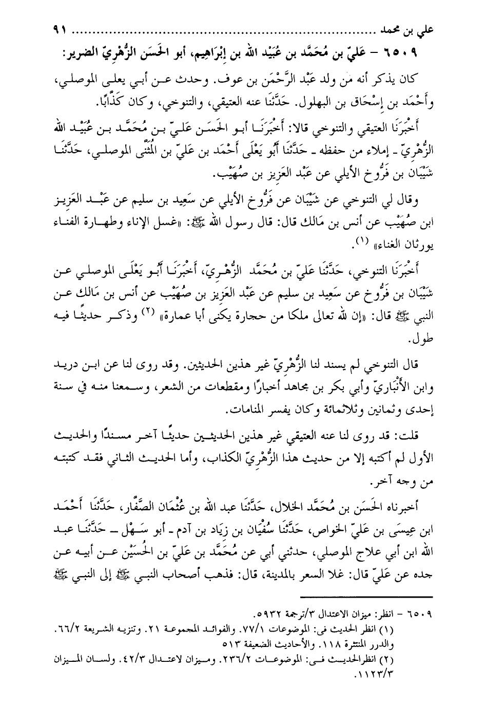 6509- عَلِيّ بْن مُحَمَّدِ بْنِ عُبَيْد اللَّهِ بْن إِبْرَاهِيم، أَبُو الحسن الزهري الضرير [1] :