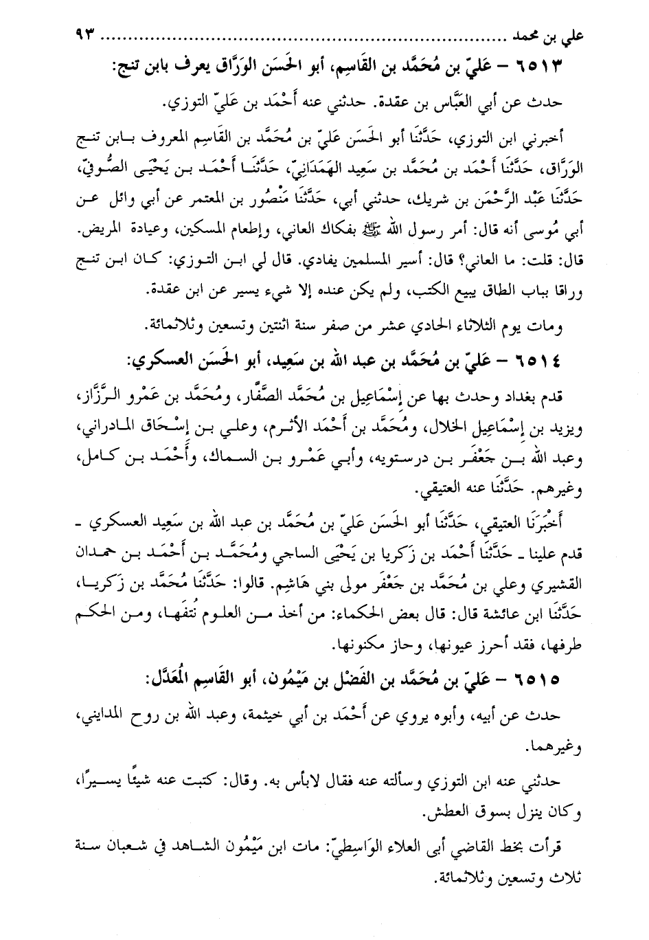 6513- علي بْن مُحَمَّد بْن القاسم، أَبُو الحسن الوراق يعرف بابن تنج: