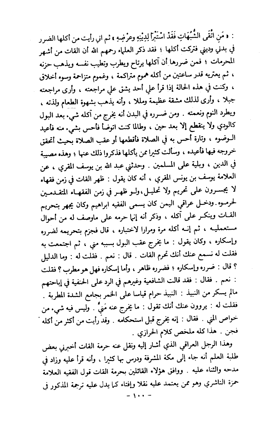 وهذا الرجل العراقي الذي أشار إليه ونقل عنه حرمة القات أخبرني بعض طلبة العلم أنه جاء إلى مكة المشرفة ودرس بها كثيراً، وأنه قرأ عليه وزاد في مدحه والثناء عليه. ووافق هؤلاء القائلين بحرمة القات قول الفقيه العلامة حمزة الناشري وهو ممن يعتمد عليه نقلاً وإفتاء كما يدل عليه ترجمة المذكور في
