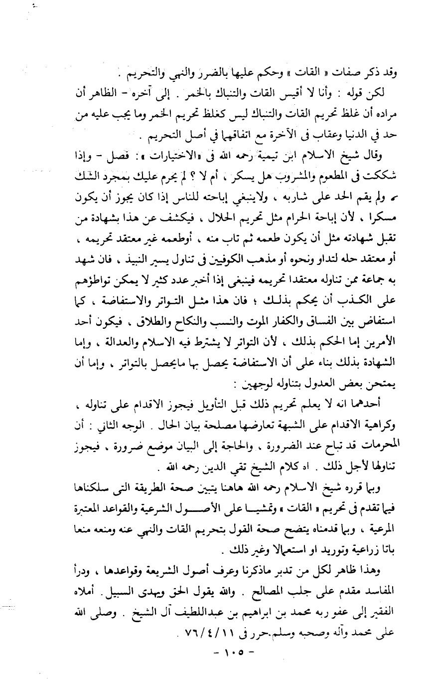 وبما قرره شيخ الإسلام رحمه الله ها هنا يتبين صحة الطريقة التي سلكناها فيما تقدن في تحريم (القات) وتمشياً على الأصول الشرعية والقواعد المعتبرة المرعية، وبما قدمناه يتضح صحة القول بتحريم القات والنهي عنه ومنعه منعاً باتاً زراعية وتوريد واستعمالاً وغير ذلك.