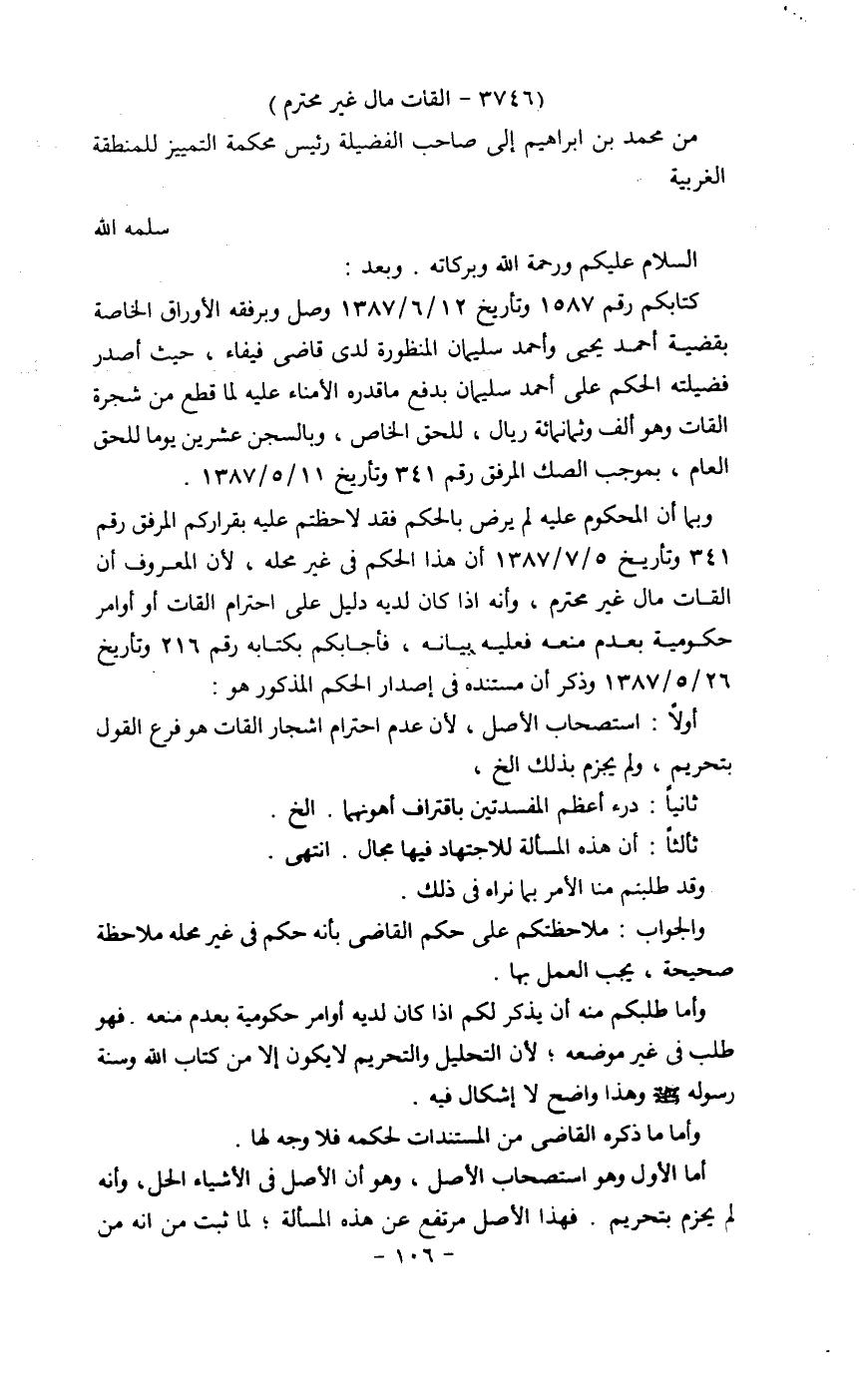 وبما أن المحكوم عليه لم يرض بالحكم فقد لاحظتم عليه بقراركم المرفق رقم 341 وتاريخ 5/7/1387 أن هذا الحكم في غير محله، لأن المعروف أن القات مال غير محترم، وأنه إذا كان لديه دليل على احترام القات أو أوامر حكومية بعدم منعه فعليه بيانه، فأجابه بكتابه رقم 216 وتاريخ 26/5/1387 وذكر أن مستنده في إصدار الحكم المذكور هو: