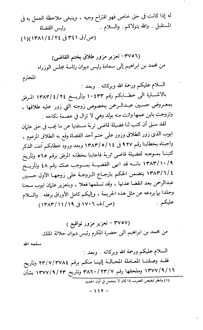 لقد سبق أن كتب لنا فضيلة قاضي تربة مستفتياً عن ما يجب في حق عثمان أيوب الذي زور الطلاق وزور على ختم أحد القضاة وقع به الطلاق المزعوم، وأجبناه بخطابنا رقم 927 في 14/5/1383 وبعد ورود خطابكم آنف الذكر كتبنا بموجبه لفضيلة قاضي تربة فأجابنا بخطابه المرفق برقم 565 وتاريخ 9/10/1383 بأنه قد أنهى القضية بموجب صك رقم 48 وتاريخ 4/6/1383 يتضمن الحكم بإرجاع الزوجة على زوجها الأول حسين عبد الرحمن بعد انقضاء عدتها، وقد تسلمتها فعلاً، وبتعزير عثمان أيوب سجناً وجلداً بما يردعه عن مثل هذه الجريمة، وإليكم كامل الأوراق برفقه. والسلام عليكم.