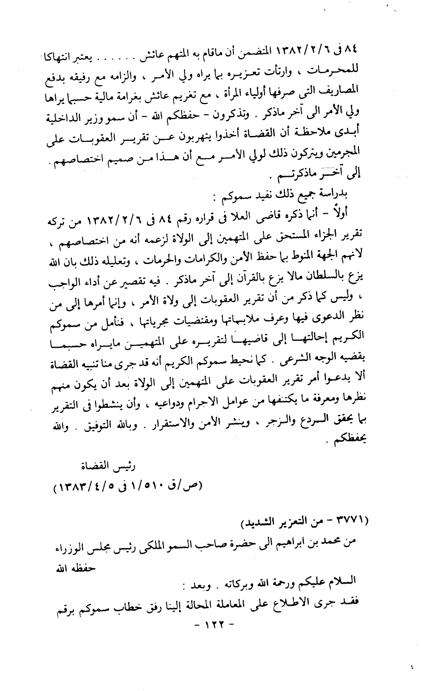 أولاً: أنما ذكره قاضي العلا في قراره رقم 84 في 6/2/1382 من تركه تقرير الجزاء المستحق على المتهمين إلى الولاة لزعمه أنه من اختصاصهم، لأنهم الجهة المنوط بها حفظ الأمن والكرامات والحرمات، وتعليله ذلك بأن الله يزع بالسلطان ما لا يزع بالقرآن إلى آخر ما ذكر. فيه تقصير عن أداء الواجب، وليس كما ذكر من أن تقرير العقوبات إلى ولاة الأمر، وإنما أمرها إلى من نظر الدعوى فيها وعرف ملابساتها ومقتضيات مجرياتها، فنأمل من سموكم الكريم إحالتها إلى قاضيها لتقريره على المتهمين ما يراه حسبما يقضيه الوجه الشرعي. كما نحيط سموكم الكريم أنه قد جرى منا تنبيه القضاة ألا يدعوا أمر تقرير العقوبات على المتهمين إلى الولاة بعد أن يكون منهم نظرها ومعرفة ما يكتفها من عوامل الإجرام ودواعيه، وأن ينشطوا في التقرير بما يحقق الردع والزجر، وينشر الأمن والاستقرار. وبالله التوفيق. والله يحفظكم.