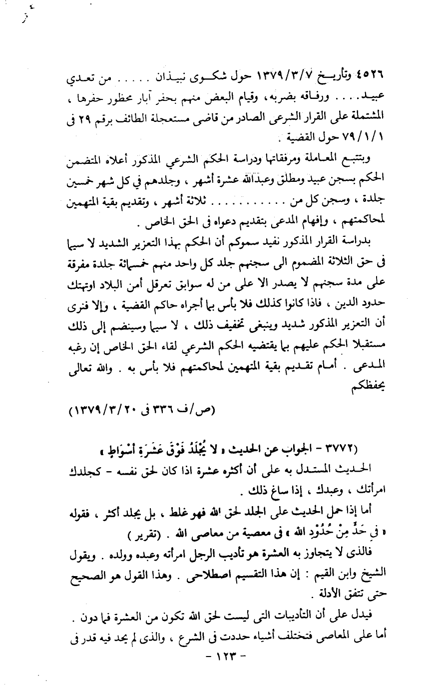 بدراسة القرار المذكور نفيد سموكم أن الحكم بهذا التعزير الشديد لا سيما في حق الثلاثة المضموم إلى سجنهم جلد كل واحد منهم خمسمائة جلدة مفرقة على مدة سجنهم لا يصدر إلا على من له سوابق تعرقل أمن البلاد أو تهتك حدود الدين، فإذا كانوا كذلك فلا بأس بما أجراه حاكم القضية، وإلا فنرى أن التعزير المذكور شديد وينبغي تخفيف ذلك، لا سيما وسينضم إلى ذلك مستقبلاً الحكم عليهم بما يقتضيه الحكم الشرعي لقاء الحق الخاص إن رغبه مستقبلاً الحكم عليهم بما يقتضيه الحكم الشرعي لقاء الحق الخاص إن رغبه المدعي. أمام تقديم بقية المتهمين لمحاكمتهم فلا بأس به. والله تعالى يحفظكم.