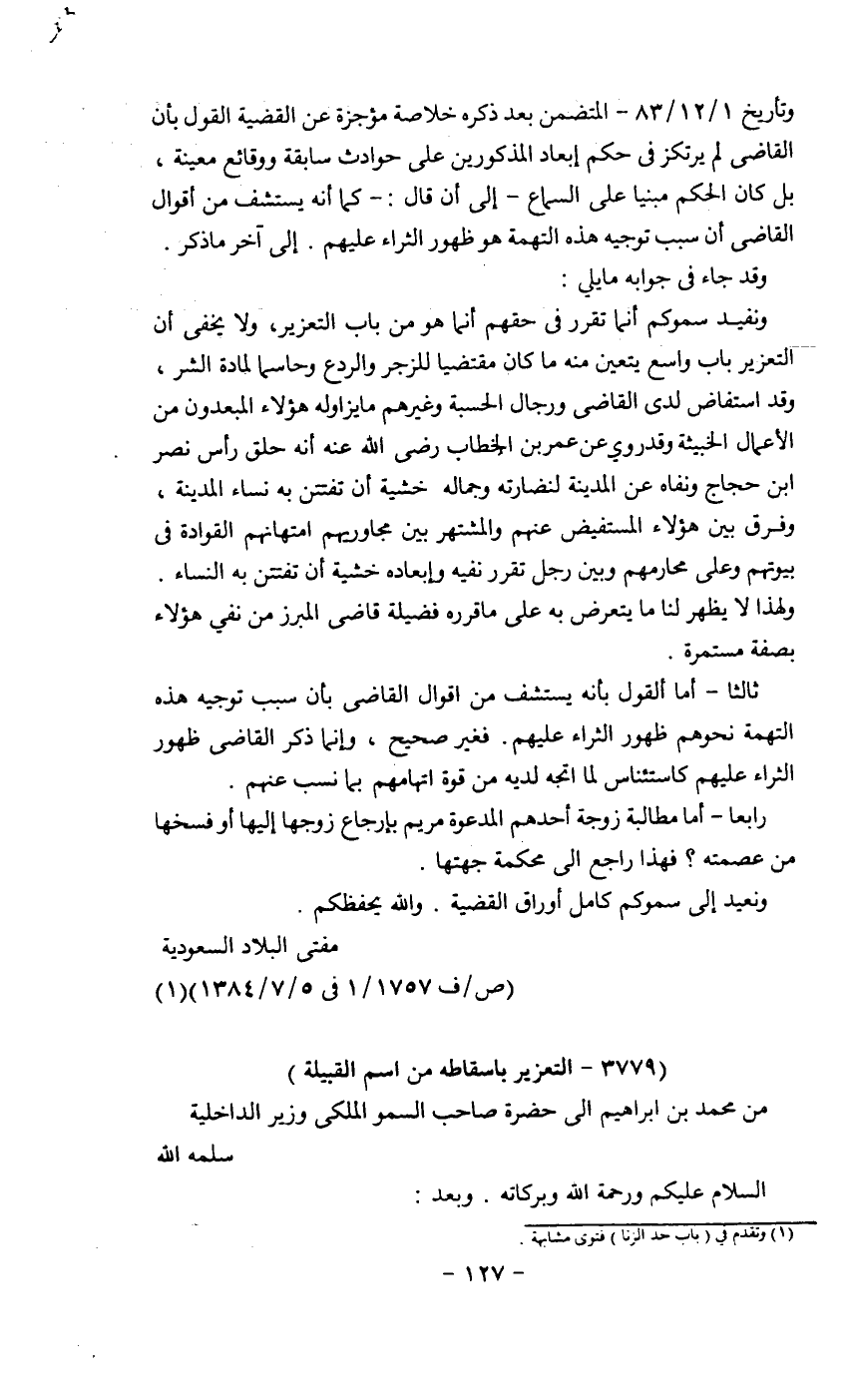ونفيد سموكم أنما تقرر في حقهم أنما هو من باب التعزير، ولا يخفى أن التعزير باب واسع يتعين منه ما كان مقتضياً للزجر والردع وحاسماً لمادة الشر، وقد استفاض لدى القاضي ورجال الحسبة وغيرهم ما يزاوله هؤلاء المبعدون من الأعمال الخبيثة وقد روي عن عمر بن الخطاب رضي الله عنه أنه حلق رأس نصر ابن حجاج ونفاه عن المدينة لنضارته وجماله خشية أن تفتتن به نساء المدينة، وفرق بين هؤلاء المستفيض عنهم والمشتهر بين مجاوريهم امتهانهم للقوادة في بيوتهم وعلى محارمهم وبين رجل تقرر نفيه وإبعاده خشية أن تفتتن به النساء.