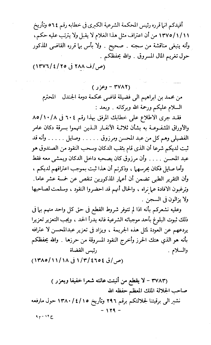 فقد جرى الإطلاع على خطابك المرفق بهذا رقم 604 في 8/10/85 والأوراق المشفوعة به بشأن ثلاثة الأنفار الذين اتهموا بسرقة دكان عامر الفضيلي وهم كل من عبد المحسن ومرزوق.... وصايل.... وأنه قد ثبت لديكم شرعاً أن الذي قام بثقب الدكان وسحب النقود من الصندوق هو عبد المحسن ... وأن مرزوق كان يصحبه داخل الدكان ويمشي معه فقط واما صايل فكان يحرسهما، وذكرتم أن هذا ثبت بموجب اعترافهم لديكم، وأن التقرير الطبي تضمن أن أعمار المذكورين تنقص عن خمسة عشر عاماً. وترغبون الإفادة عما نراه، والحال أنهم قد أحضروا النقود، وسلمت لصاحبها ولا يزالون في السجن.