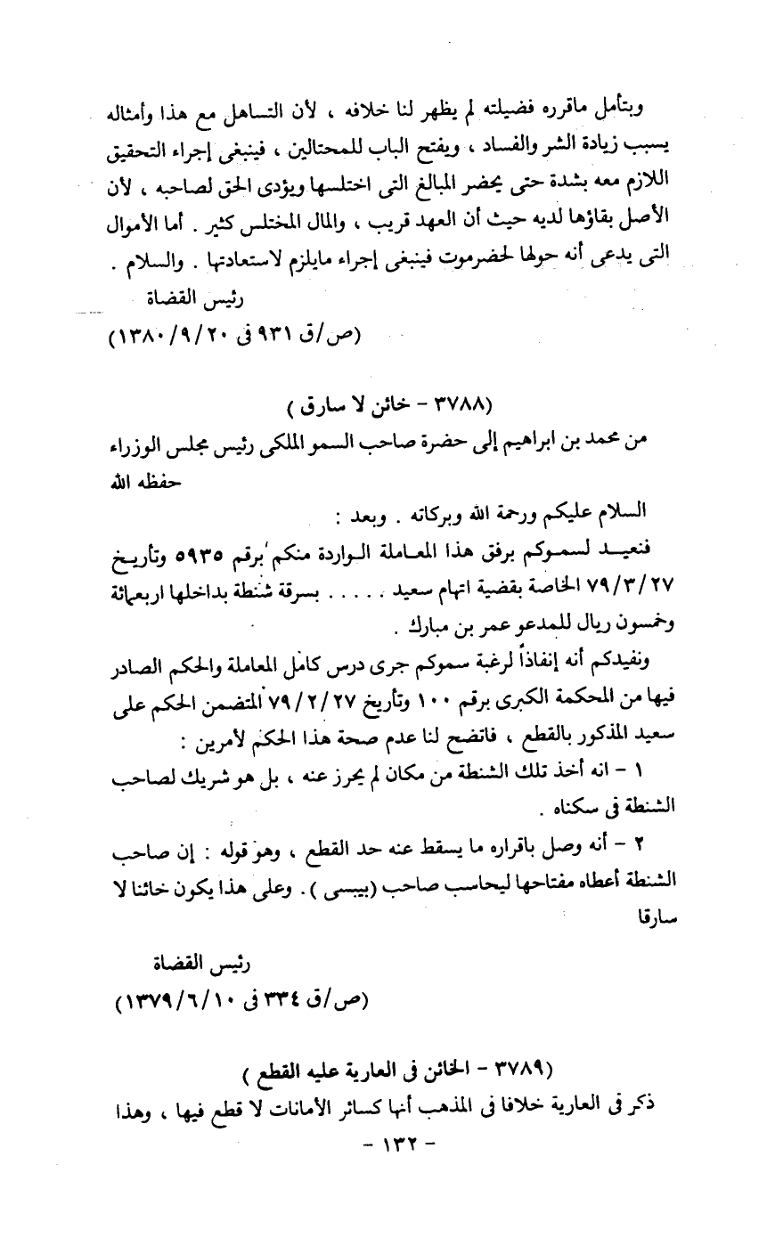 ونفيدكم أنه إنفاذاً لرغبة سموكم جرى درس كامل المعاملة والحكم الصادر فيها من المحكمة الكبرى برقم 100 وتاريخ 27/2/79 المتضمن الحكم على سعيد المذكور بالقطع، فاتضح لنا عدم صحة هذا الحكم لأمرين:
