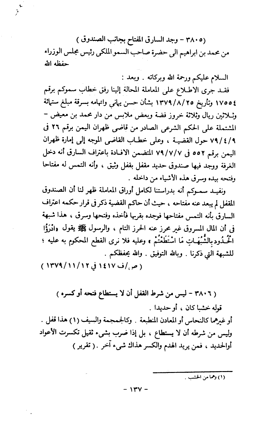 فقد جرى الإطلاع على المعاملة المحالة إلينا رفق خطاب سموكم برقم 17554 وتاريخ 25/8/179 بشأن حسن يماني واتهامه بسرقة مبلغ ستمائة وثلاثين ريال وثلاثة خروز فضة وبعض ملابس من دار محمد بن معيض - المشتملة على الحكم الشرعي الصادر من قاضي ظهران اليمن برقم 26 في 9/4/79 حول القضية، وعلى خطاب القاضي الموجه إلى إمارة اليمن برقم 552 في 7/7/79 المتضمن الإفادة باعتراف السارق أنه دخل الغرفة ووجد فيها صندوق حديد مقفل بقفل وثيق، وأنه ألتمس له مفتاحاً وفتحه بيده وسرق هذه الأشياء من داخله.