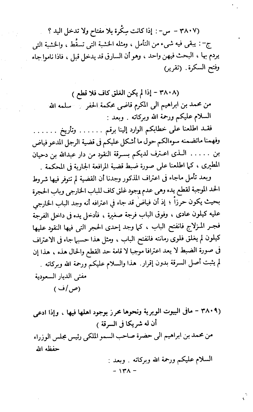 وبعد تأمل ما جاء في اعتراف المذكور وجدنا أن القضية لم تتوفر فيها شروط الحد الموجبة لقطع يده وهي عدم وجود غلق كاف للباب الخارجي وباب الحجرة بحيث يكون حرزاً، إذا أن فياض قد جاء في اعترافه أنه وجد الباب الخارجي عليه كيلون عادي، وفوق الباب فرجة صغيرة، فأدخل يده في داخل الفرجة فجر المزلاج فانفتح الباب، كما وجد إحدى هذا حسبما جاء في الاعتراف في صورة الضبط لا يعد اعترافاً موجباً لا قامة حد القطع والحال هذه، هذا إن لم يثبت أصل السرقة موجباً لإقامة حد القطع والحال هذه، هذا إن لم يثبت أصل السرقة بدون إقرار. هذا والسلام عليكم ورحمة الله وبركاته.