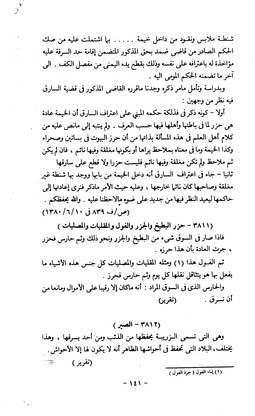 أولاً ـ كونه ذكر في فذلكة حكمه المبني على اعتراف السارق أن الخيمة عادة هي حرز لما في باطنها وأهلها فيها حسب العرف. ولم ينتبه إلى ما نص عليه من كلام أهل العلم في هذه المسالة بذاتها من أن حرز البيوت في بساتين وصحراء وكذا الخيمة ومافي معناه بملاحظ يراها أو بكونها مغلقة وفيها نائم، فإن لم يكن ثم ملاحظ ولم تكنمغلقة وفيها نائم فليست حرزاً ولا قطع على سارقها.