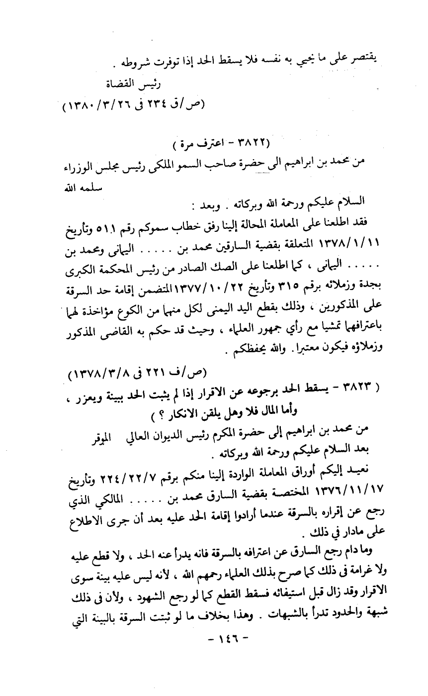نعيد إليكم أوراق المعاملة الواردة إلينا منكم برقم 7/22/224 وتاريخ 17/11/1376هـ المختصة بقضية السارق محمد بن.. المالكي الذي رجع عن إقراره بالسرقة عندما أرادوا إقامة الحد عليه بعد أن جرى الاطلاع على مادار في ذلك.......