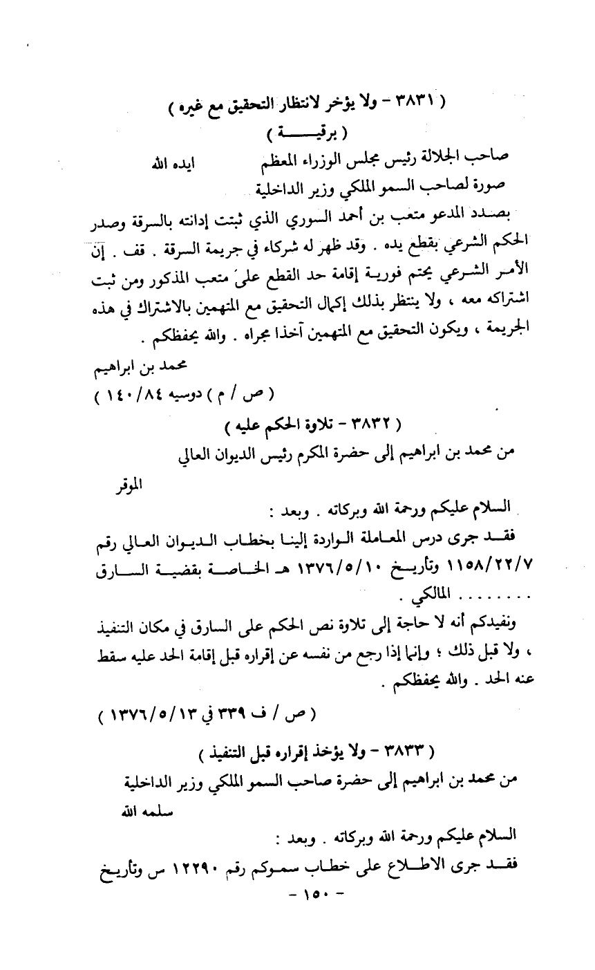 بصدد المدعو مشعب بن أحمد السوري الذي ثبتت إدانته بالسرقة وصدر الحكم الشرعي بقطع يده. وقد ظهر له شركاء في جرىمة السرقة. قف. أن الأمر الشرعي يحتم فورية إقامة حد القطع على مشعب المذكور ومن ثبت اشتراكه معه , ولا ينتظر بذلك إكمال التحقيق مع المتهمين بإلاشتراك في هذه الجريمة ويكون التحقيق مع المتهمين أخذ مجراه. والله يحفظكم.