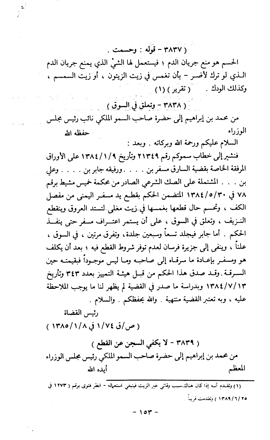 أن يستمر إعتراف مسفر حتى ينفذ الحكم. أما جابر فيجلد تسعاً وسبعين جلده , وتفرق مرتين في السوق, علنا ً, وينفى إلى جزيرة فرسان لعدم توفر شروط القطع فيه؛ بعد أن يكلف هو ومسفر بإعادة ما سرقاه إلى صاحبة وما ليس موجوداً فقيمته حين السرقة. وقد صدق هذا الحكم من قبل هيئة التميز بعدد 343 وتاريخ 13/7/1384 وبدارسة ما صدر في القضية لم يظهر لنا ما يوجب الملاحظة عليه , وتعتبر القضية منتهية. والله يحفظكم. والسلام.