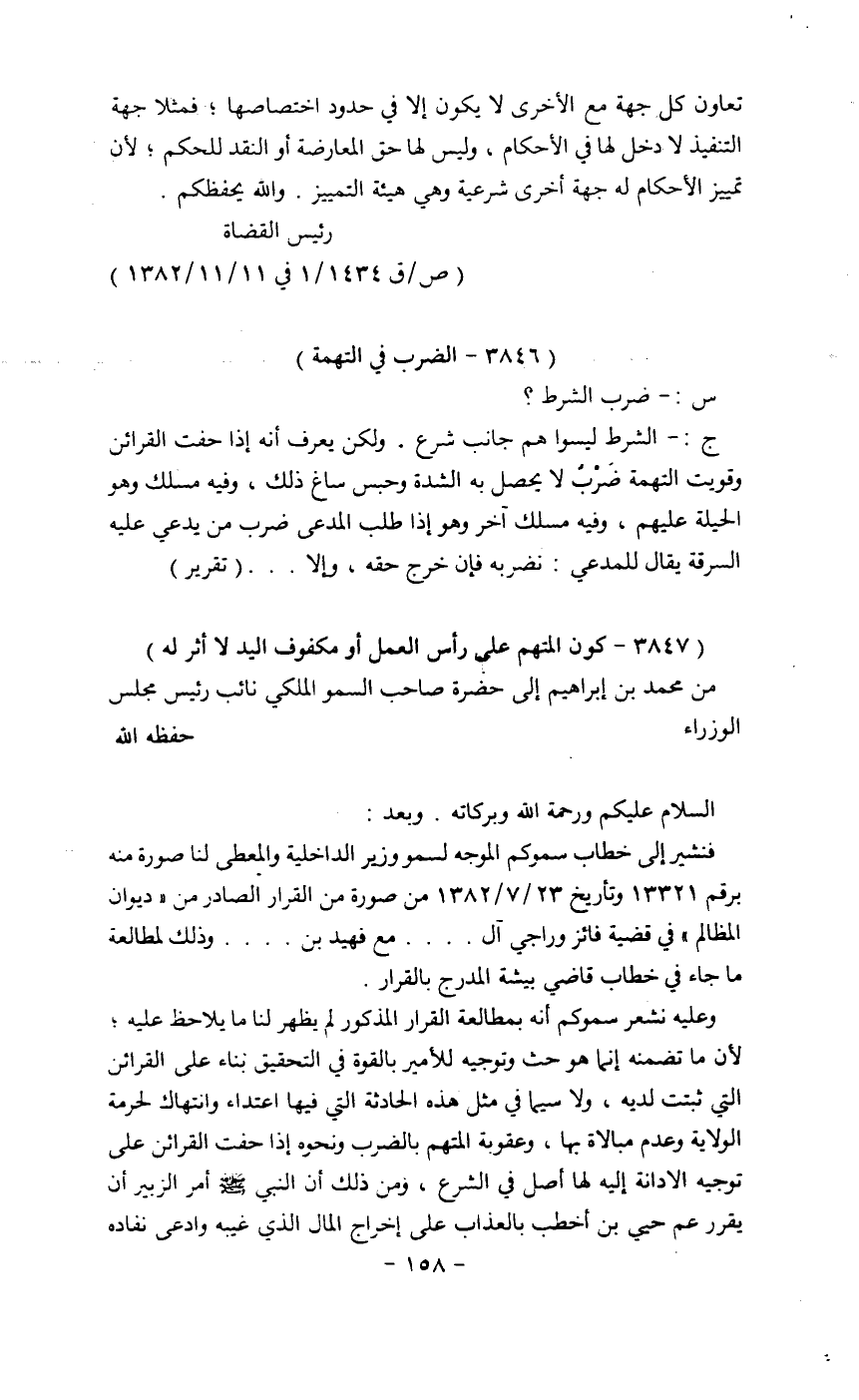 وعليه نشعر سموكم أنه بمطالعه القرار المذكور لم يظهر لنا ما يلاحظ عليه؛ لأن ما تضمنه أنما هو حث وتوجيه للأمير بالقوة فى التحقيق بناء على القرائن التى ثبت لديه، ولا سيما فى مثل هذه الحادثة التى فيها أعتداء وانتهاك لحرمة الولاية وعدم مبالاه بها , وعقوبة المتهم بالضرب ونحوه إذا حقت القرائن على توجيه إلادانه إليه لها أصل فى الشرع , ومن ذلك أن النبى صلى الله وعليه وسلام أمر الزبير أن يقرر عم حيى بن أخطب بالعذاب على أخراج المال الذى غيبه وأدعى نفاده
