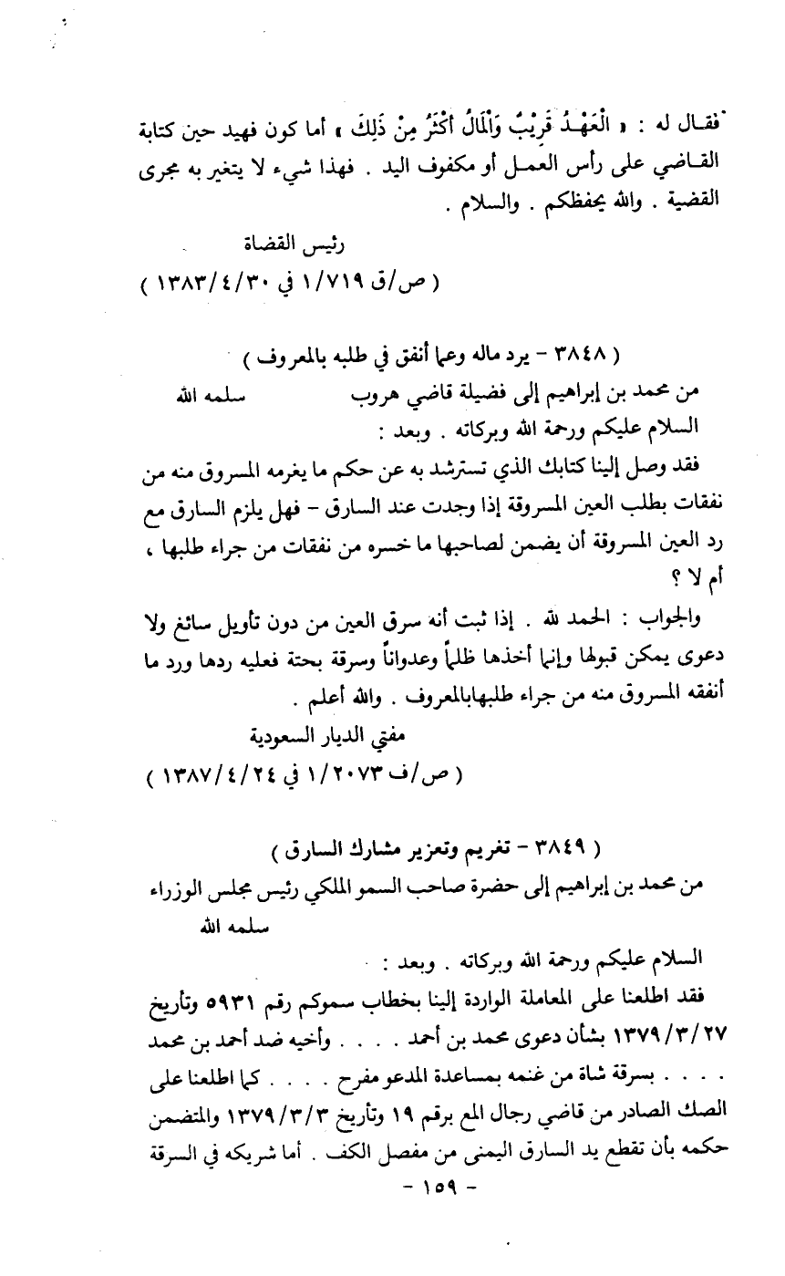 27/3/1379بشأن دعوى محمد بن أحمد........ وأخيه ضد أحمد بن محمد......... بسرقة شاة من غنمه بمساعدة المدعو مفرح....... كما اطلعنا على الصك الصادر من قاضي رجال المع برقم 19 وتاريخ 3/3/1379 والمتضمن حكمه بأن تقطع يد السارق اليمنى من مفصل الكف. أما شريكه في السرقة