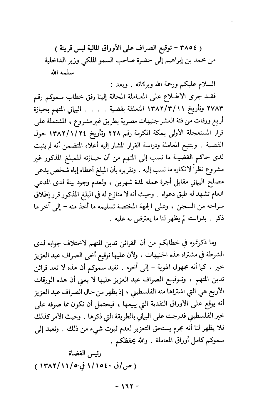 عبد العزيز عليها لا يعنى أن هذه الورقات الأربع هي التي اشتراها منه الفلسطيني؛ إذا يظهر من حال الصراف عبد العزيز أنه يوقع على الأوراق النقدية التي يبيعها. فيحتمل أن يكون مما صرفه على خبز الفلسطيني فدرجت على اليماني بالطريقة التي ذكرها , وحيث الأمر كذلك فلا يظهر لنا أنه مجرم يستحق التعزيز لعدم ثبوت شيء من ذلك. ونعيد إلى سموكم كامل أوراق المعاملة. والله يحفظكم.