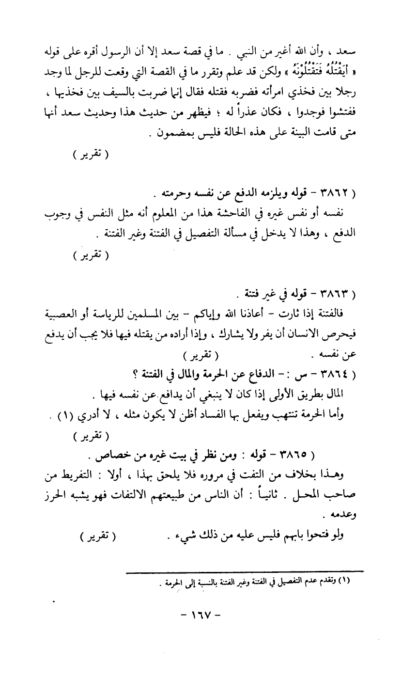 فالفتنه إذا ثارت _ أعاذنا الله وإياكم _ بين المسلمين للرياسة أو العصبية فيحرص الإنسان فأن يفر ولا يشارك، وإذا اراد من يقتله فيها فلا يجب أن يدفع عن نفسه.