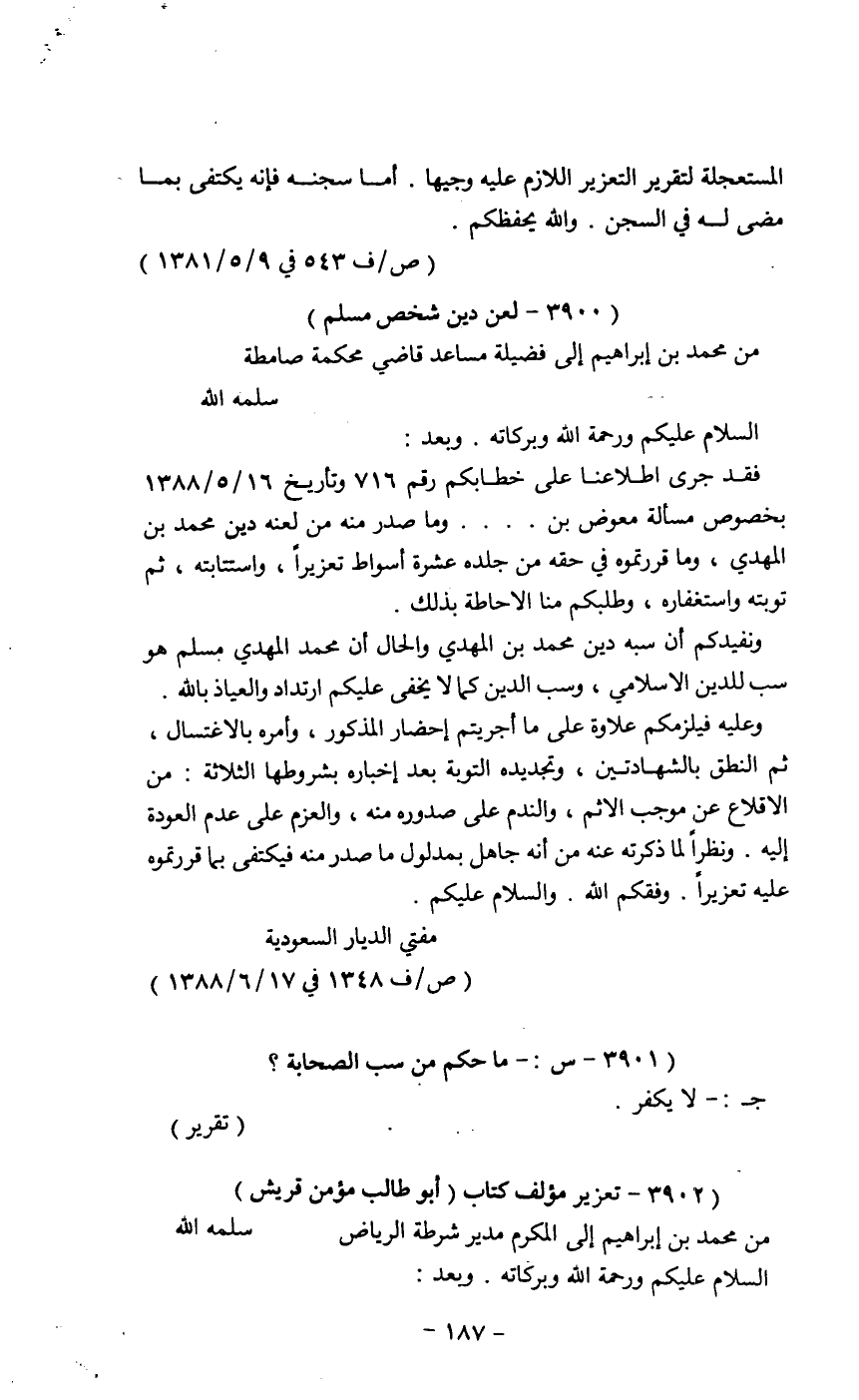 ونفيدكم أ، سبه دين محمد بن المهدي والحال أن محمد المهدي مسلم هو سب للدين الإسلامي، وسب الدين كما لا يخفي عليكم ارتداد والعياذ بالله. وعليه فيلزمكم علاوه على ما أجرىتم احضار المذكور، وأمره بإلاغتسال، ثم النطق بالشهادتين، وتجديده التوبة بعد أخباره بشروطها الثلاثة: من إلاقلاع عن موجب إلاثم، والندم على صدوره منه، والعزم على عدم العودة إليه. ونظراً لما ذكرته عنه من أنه جاهل بمدلول ما صدر منه فيكتفي بما قررتموه عليه تعزيزاً. وفقكم الله. والسلام عليكم.