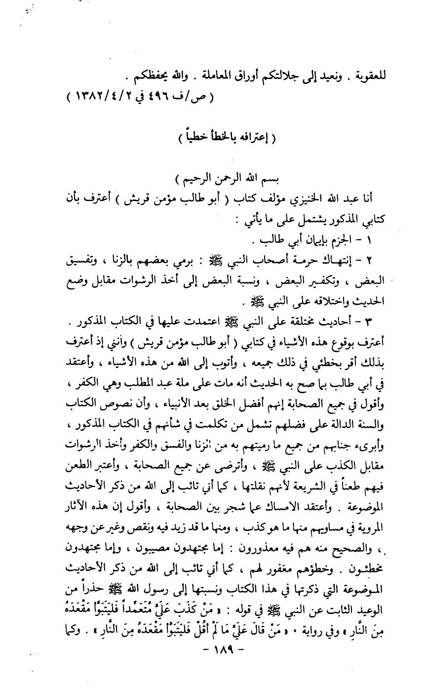 أحاديث مختلفه على النبي - رضي الله عنهم - اعتمدت عليها في الكتاب المذكور أعترف بوقوع هذه إلاشيءاء في كتابي (أبي طالب مؤمن قريش) وأنني اذ أعترف بذلك أقر بخطئي في ذلك جميعه، وأتوب إلى الله من هذه إلاشيءاء، وأعتقد في أبي طالب بما صح به الحديث أنه مات على ملة عبد المطلب وهي الكفر، وأقول في جميع الصحابة انهم أفضل الخلق بعد إلأنبياء، وأن نصوص الكتاب والسنه الدالة على فضلهم تشمل من تكلمت في شأنهم في الكتاب المذكور، وأبري جانبهم من جميع ما رميتهم به من الزنا والفسق والكفر وأخذ الرشوات مقابل الكذب على النبي - رضي الله عنهم -، وأترضي عن جميع الصحابة، وأعتبر الطعن فيهم طعناً في الشريعة لأنهم نقلتها، كما أني تائب إلى الله من ذكر الأحاديث الموضوعة. وأعتقد إلامساك عما شجر بين الصحابة، وأقول إن هذه إلاثار المروية في مساويهم منها ما هو كذب، ومنها ما قد زيد فيه ونقص وغير عن وجهة، الصحيح منه هم فيه معذورون: إما مجتهدون مصيبون، واما مجتهدين مخطئون. وخطؤهم مغفور لهم، كما أتي تائب إلى الله من ذكر الأحاديث الموضوعة التي ذكرتها في هذا الكتاب ونسبتها إلى الرسول الله - رضي الله عنهم - حذراً من الوعيد الثابت عن النبي - رضي الله عنهم - في قوله: "من كذب على متعمداً فليتبوا مقعده من النار "وفي رواية. " من قال على ما لم أقل فليتبوا مقعده من النار " وكما