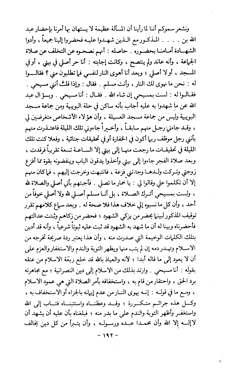 وأخيراً جاءوني تلك الليلة فاعتذرت منهم الليلة في تحقيقات ما رجعت منها إلى بيتي إلا الساعة تسعة تقريبا فرقدت، وبعد صلاة الفجر جاءوا إلى بيتي وأخذوا يدقون الباب وينقضونه بقوة مما أفزع زوجتي وتركت ولدها وجاءتني فزعة، فانتبهت وخرجت إليهم، فما كان منهم إلا أن تكلموا على وقالوا لي: يا حمار ما تصلي. فأجبتهم بأني أصلي والصلاة لله، ولست بمسيحي أترك الصلاه، بل أنا مسلم أصلي لله ولا أصلي خوفاً من أحد، وأن كل ما نسبوه إلى خلاف هذا فلا صحة له. وبعد سماع كلامهم تقرر توقيف المذكور لبينما يحضر من يزكي الشهود؛ فحضر من زكاهم وثبتت عدالتهم فأحضرناه وبينا له أن ما شهد به الشهود قد ثبت عليه ثبوتا شرعياً، وأنه قد أدين بتلك الكلمات الوخيمة التي صدرت منه، وأن هذا يعتبر ردة صريحة تخرجه من الإسلام وتهدر دمه إن لم يتب منها ويظهر التوبة والندم وإلاستغفار والعزم على أن لا يعود إلى ما قاله أبدا؛ لأنه والعياذ بالله قد خلع ويعه الإسلام من عنقه بقوله: أنا مسيحي.................................................