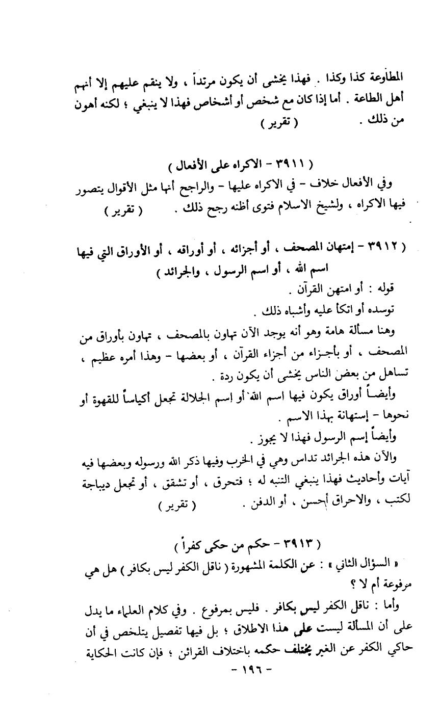 3912 - امتهان المصحف، أو أجزائه، أو أوراقه، أو أوراق التي فيها اسم الله، أو اسم الرسول، والجرائد)