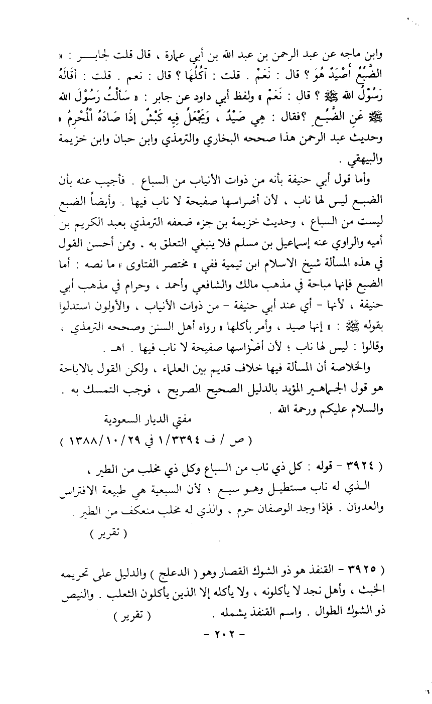 وابن ماجه عن عبد الرحمن بن عبد الله بن أبي عمارة، قال قلت لجابر: (الضبع أصيد هو؟ قال: نعم. قلت: واكلها؟ قال: نعم. قلت: اقاله رسول الله - صلى الله عليه وسلم -؟ قالى: نعم) ولفظ أبي داود عن جابر: (سالت رسول الله - صلى الله عليه وسلم - عن الضبع؟ فقال: هي صيد، ويجعل فيه كبش إذا صاده المحرم) وحديث عبد الرحمن هذا صححه البخاري والترمذي وابن حيان وابن خزيمه وإلالبيهقي.......