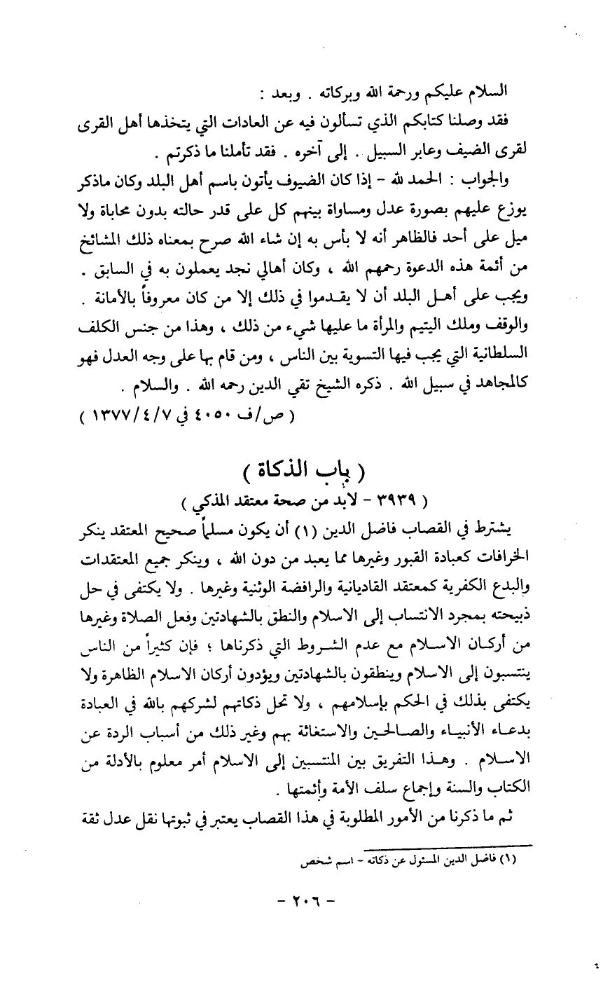 فقد وصلنا كتابكم الذي تسألون فيه عن العادات التي يتخذها أهل القري لقري الضيف وعابر سبيل. إلى اخره. فقد تأملنا ما ذكرتم.