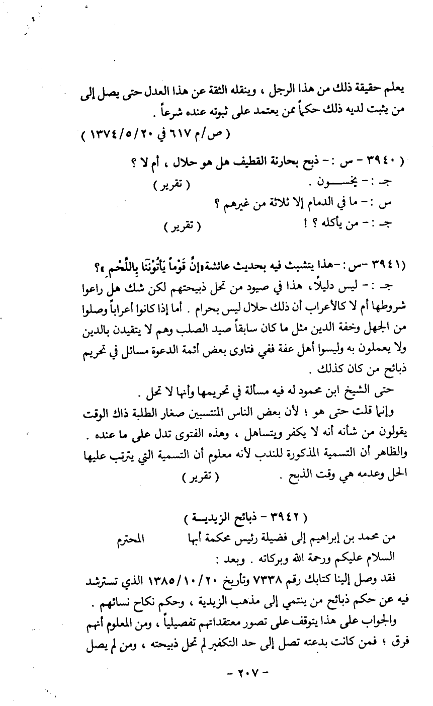فقد وصلنا كتابك رقم 7338 وتاريخ 20/10/1385 الذي تسترشد فيه عن حكم ذبائح من ينتمي إلى مذهب الزيدية، وحكم نكاح نسائهم.