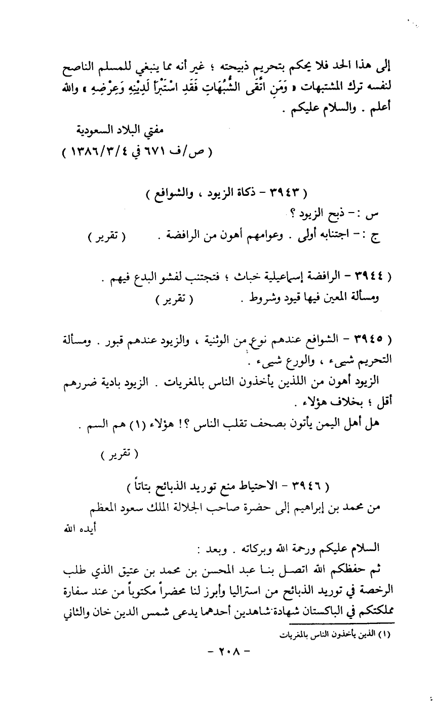 ثم حفظكم الله اتصل بنا عبد المحسن بن محمد بن عتيق الذي طلب الرخصة في توريد الذبائح من استرإلىا وأبرز لنا محضراً مكتوباً من عند سفارة مملكتكم في الباكستان شهادة شاهدين أحدهما يدعي شمس الدين خان والثاني
