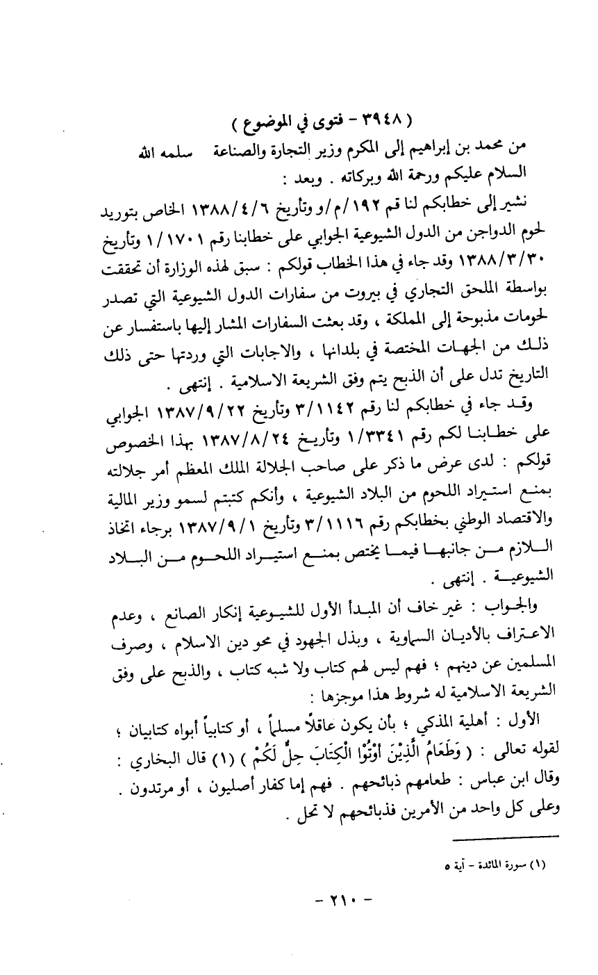 نشيءر إلى خطابكم لنا رقم 192/م/وتاريخ 6/4/1388 الخاص بتوريد لحوم الدواجن من الدول الشيءوعية الجوابي على خطابنا رقم 1701 /1 وتاريخ 30/3/1388 وقد جاء في هذا الخطاب قولكم: سبق لهذه الوزارة أن تحققت بواسطة الملحق التجاري في بيروت من سفارات الدول الشيءوعية التي تصدر لحومات مذبوحة إلى المملكة، وقد بعثت السفارات المشار إليها باستفسار عن ذلك من الجهات المختصة في بلدانها، وإلاجابات التي وردتها حتى ذلك التاريخ تدل على أن الذبح يتم وفق الشريعة الإسلامية. انتهي.