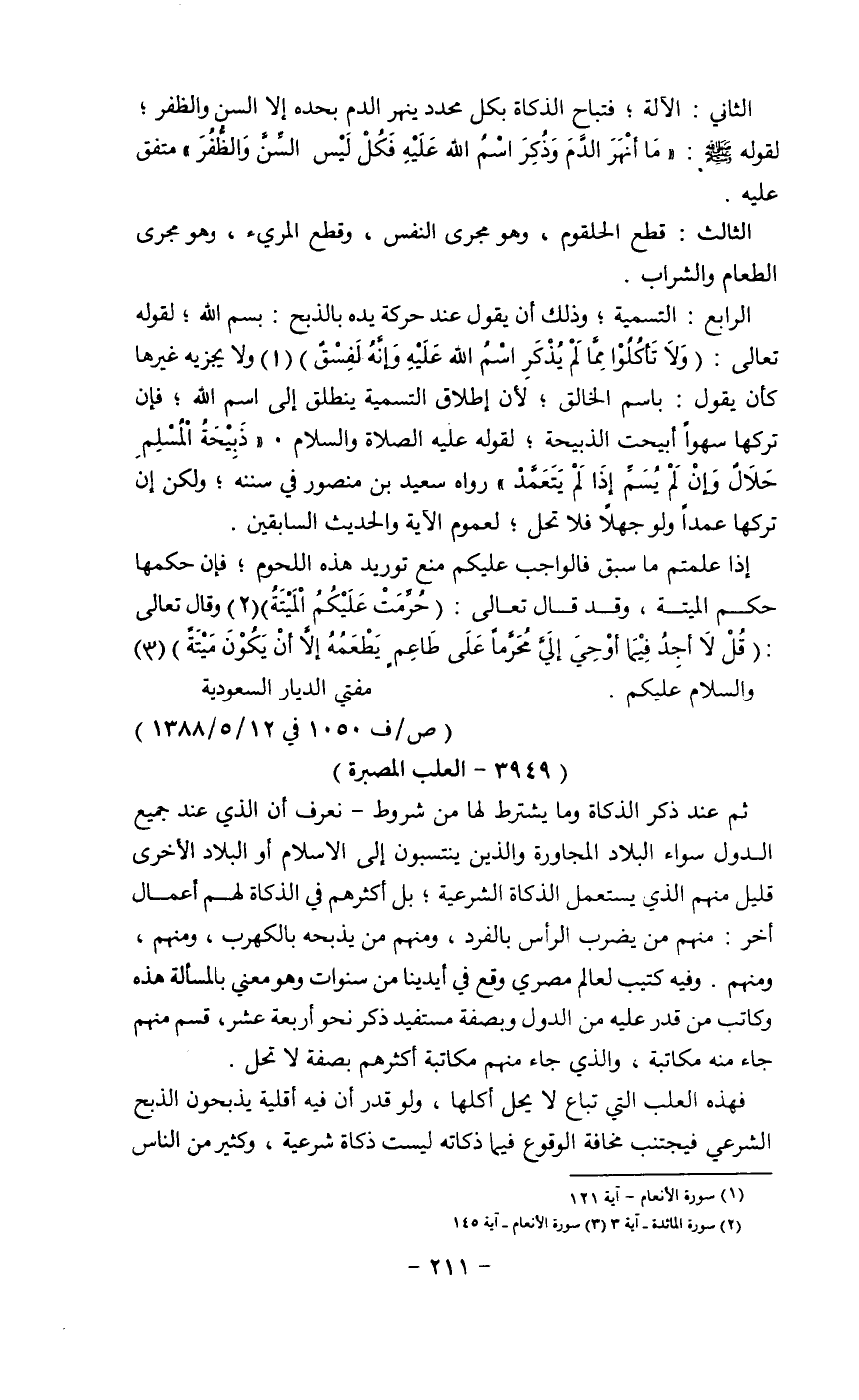 ثم عند ذكر الذكاة وما يشترط لها من شروط _ نعرف أن الذي عند جميع الدول سواء البلاد المجاورة والذين ينتسبون إلى الإسلام أو البلاد الآخرى قليل منهم الذي يستعمل الذكاة الشرعية؛ بل لأكثرهم في الذكاة لهم أعمال