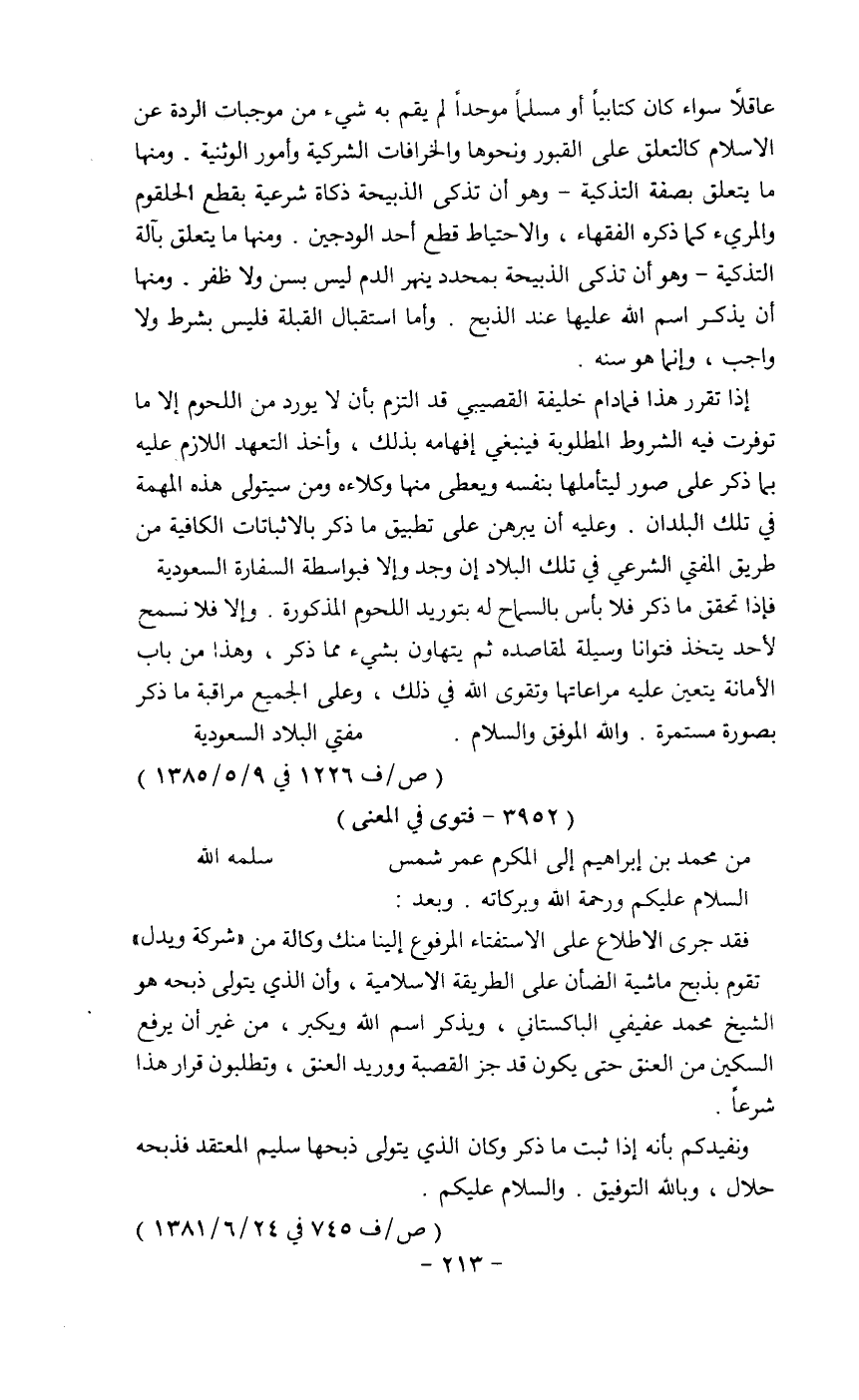 إذا تقرر هذا فما دام خليفة القصيبي قد التزم بأن لا يورد من اللحوم إلا ما توفرت فيه الشروط المطلوبة فينبغي افهامة بذلك، وأخذ التعهد اللزم عليه بما ذكر على صور ليتأملها بنفسه ويعطي منها وكلاءه ومن سيتولي هذه المهمة في تلك البلدان. وعليه أن يبرهن على تطبيق ما ذكر بإلاثباتات الكافية من طريق المفتي الشرعي في تلك البلاد ان وجد وإلا فبواسطة السفارة السعودية فإذا تحقق ما ذكر فلا بأس بالسماح له بتوريد اللحوم المذكورة. وإلا فلا نسمح لأحد يتخذ فتوانا وسيلة لمقاصدة ثم يتهاون بشيءء مما ذكر، وهذا من باب إلامانة يتعين عليه مراعاتها وتقوي الله في ذلك، وعلى الجميع مراقبة ما ذكر بصورة مستمرة _ والله الموفق والسلام عليكم. ... مفتي البلاد السعودية